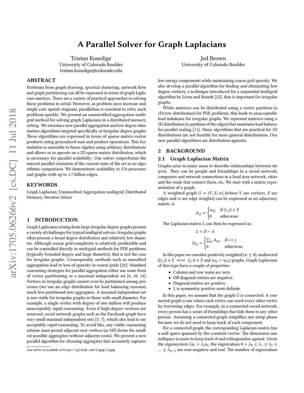 Problems from graph drawing, spectral clustering, network flow and graph partitioning can all be expressed in terms of graph Laplacian matrices. There are a variety of practical approaches to solving these problems in serial. However, as problem sizes increase and single core speeds stagnate, parallelism is essential to solve such problems quickly. We present an unsmoothed aggregation multigrid method for solving graph Laplacians in a distributed memory setting. We introduce new parallel aggregation and low degree elimination algorithms targeted specifically at irregular degree graphs. These algorithms are expressed in terms of sparse matrix-vector products using generalized sum and product operations. This formulation is amenable to linear algebra using arbitrary distributions and allows us to operate on a 2D sparse matrix distribution, which is necessary for parallel scalability. Our solver outperforms the natural parallel extension of the current state of the art in an algorithmic comparison. We demonstrate scalability to 576 processes and graphs with up to 1.7 billion edges.