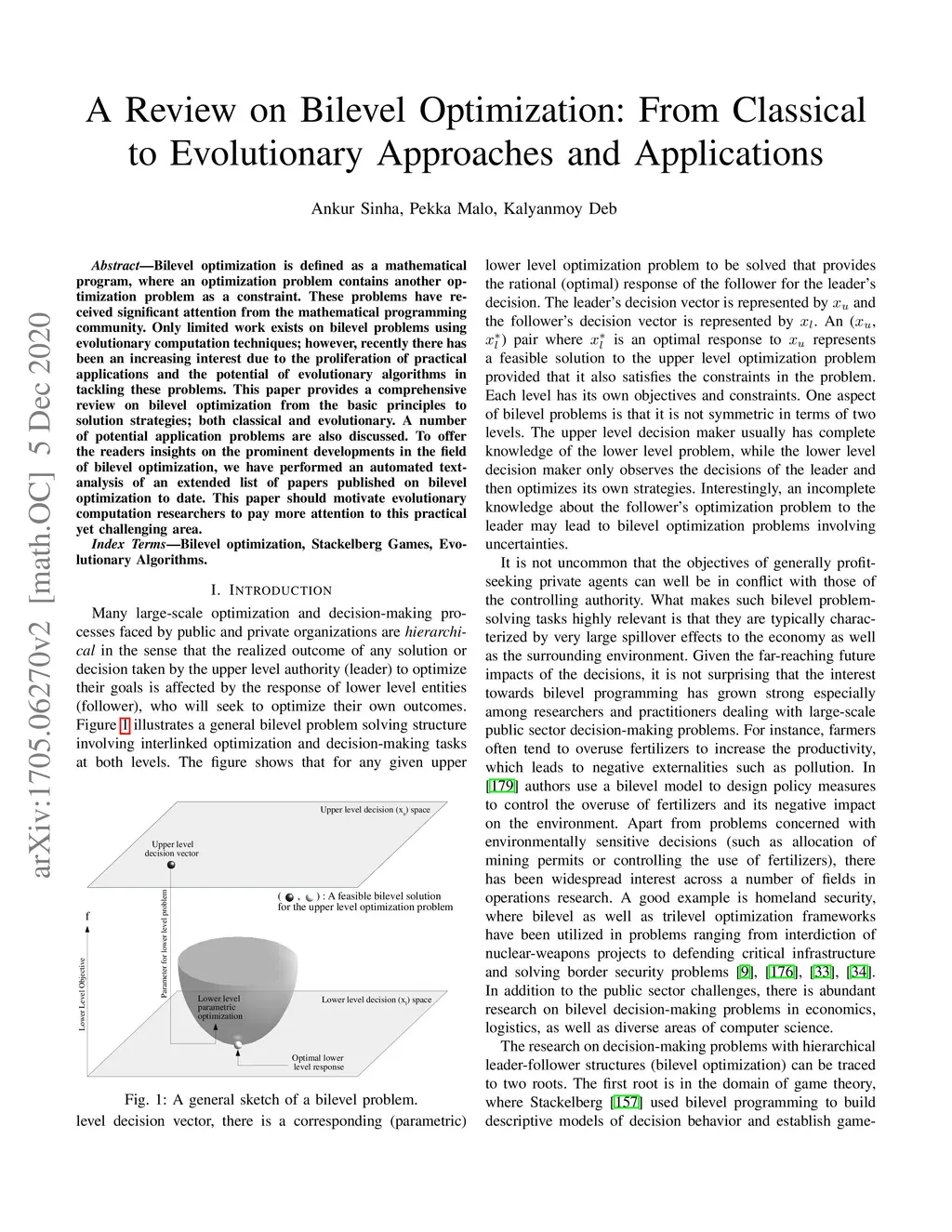 Bilevel optimization is defined as a mathematical program, where an optimization problem contains another optimization problem as a constraint. These problems have received significant attention from the mathematical programming community. Only limited work exists on bilevel problems using evolutionary computation techniques; however, recently there has been an increasing interest due to the proliferation of practical applications and the potential of evolutionary algorithms in tackling these problems. This paper provides a comprehensive review on bilevel optimization from the basic principles to solution strategies; both classical and evolutionary. A number of potential application problems are also discussed. To offer the readers insights on the prominent developments in the field of bilevel optimization, we have performed an automated text-analysis of an extended list of papers published on bilevel optimization to date. This paper should motivate evolutionary computation researchers to pay more attention to this practical yet challenging area.