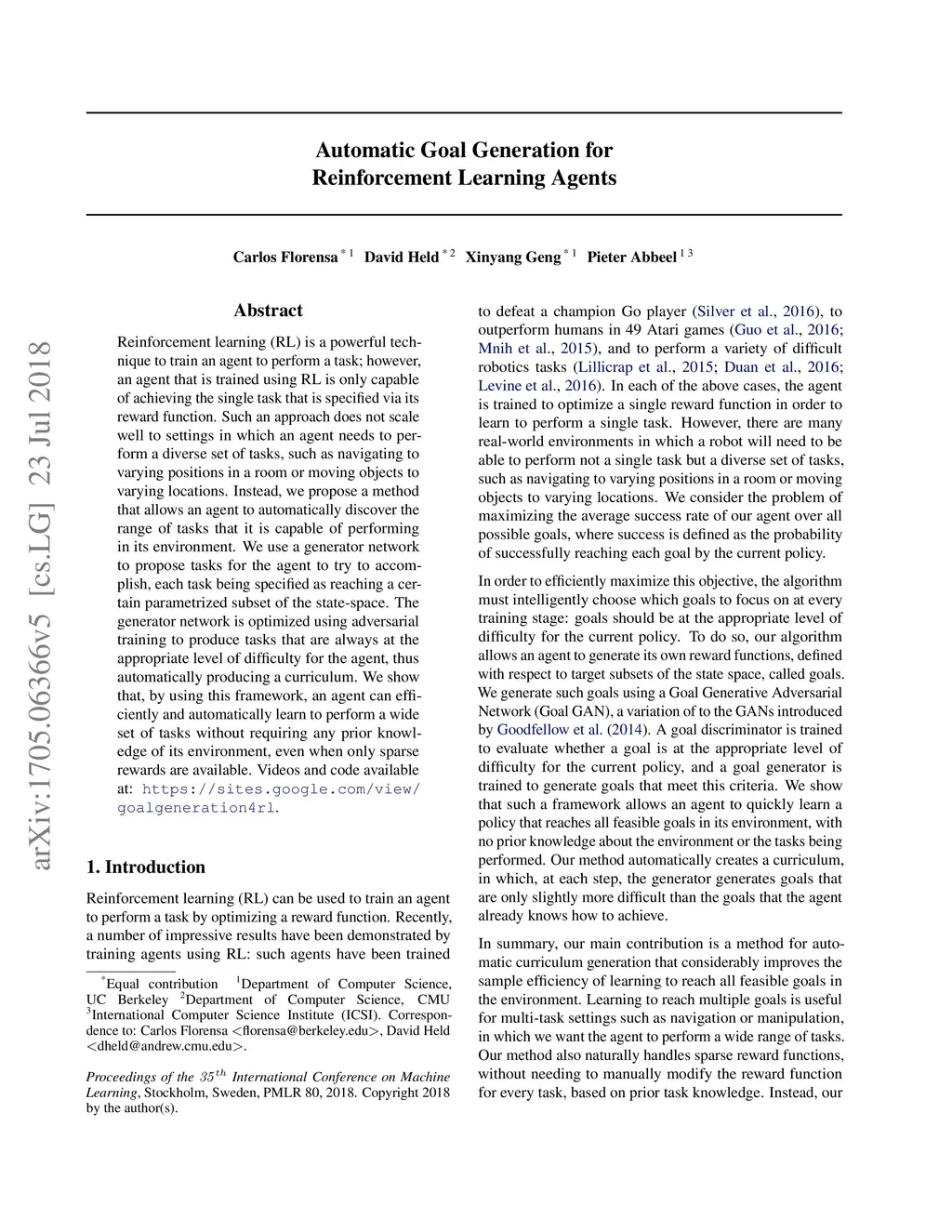 Reinforcement learning is a powerful technique to train an agent to perform a task. However, an agent that is trained using reinforcement learning is only capable of achieving the single task that is specified via its reward function. Such an approach does not scale well to settings in which an agent needs to perform a diverse set of tasks, such as navigating to varying positions in a room or moving objects to varying locations. Instead, we propose a method that allows an agent to automatically discover the range of tasks that it is capable of performing. We use a generator network to propose tasks for the agent to try to achieve, specified as goal states. The generator network is optimized using adversarial training to produce tasks that are always at the appropriate level of difficulty for the agent. Our method thus automatically produces a curriculum of tasks for the agent to learn. We show that, by using this framework, an agent can efficiently and automatically learn to perform a wide set of tasks without requiring any prior knowledge of its environment. Our method can also learn to achieve tasks with sparse rewards, which traditionally pose significant challenges.