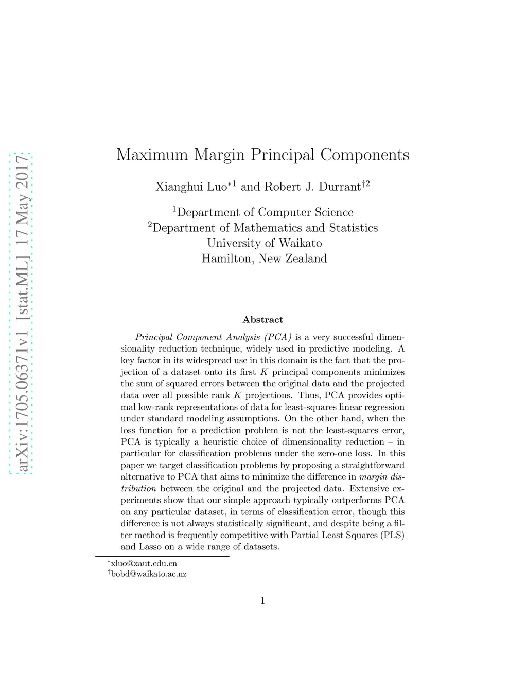 Principal Component Analysis (PCA) is a very successful dimensionality reduction technique, widely used in predictive modeling. A key factor in its widespread use in this domain is the fact that the projection of a dataset onto its first principal components minimizes the sum of squared errors between the original data and the projected data over all possible rank projections. Thus, PCA provides optimal low-rank representations of data for least-squares linear regression under standard modeling assumptions. On the other hand, when the loss function for a prediction problem is not the least-squares error, PCA is typically a heuristic choice of dimensionality reduction -- in particular for classification problems under the zero-one loss. In this paper we target classification problems by proposing a straightforward alternative to PCA that aims to minimize the difference in margin distribution between the original and the projected data. Extensive experiments show that our simple approach typically outperforms PCA on any particular dataset, in terms of classification error, though this difference is not always statistically significant, and despite being a filter method is frequently competitive with Partial Least Squares (PLS) and Lasso on a wide range of datasets.