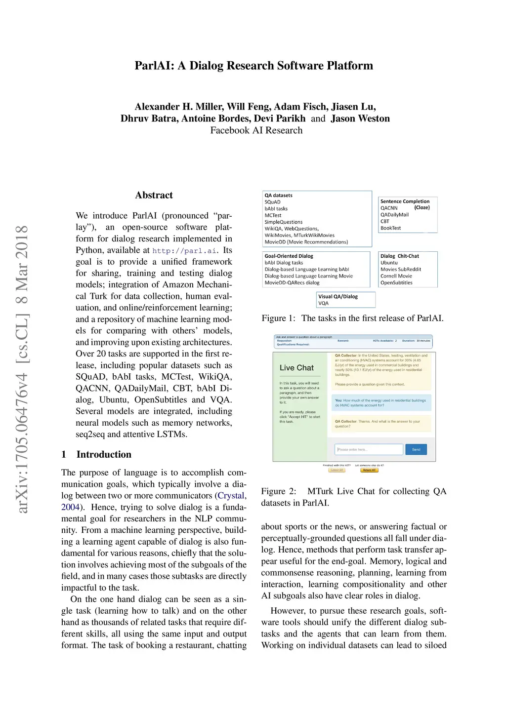 We introduce ParlAI (pronounced "par-lay"), an open-source software platform for dialog research implemented in Python, available at http://parl.ai. Its goal is to provide a unified framework for sharing, training and testing of dialog models, integration of Amazon Mechanical Turk for data collection, human evaluation, and online/reinforcement learning; and a repository of machine learning models for comparing with others' models, and improving upon existing architectures. Over 20 tasks are supported in the first release, including popular datasets such as SQuAD, bAbI tasks, MCTest, WikiQA, QACNN, QADailyMail, CBT, bAbI Dialog, Ubuntu, OpenSubtitles and VQA. Several models are integrated, including neural models such as memory networks, seq2seq and attentive LSTMs.