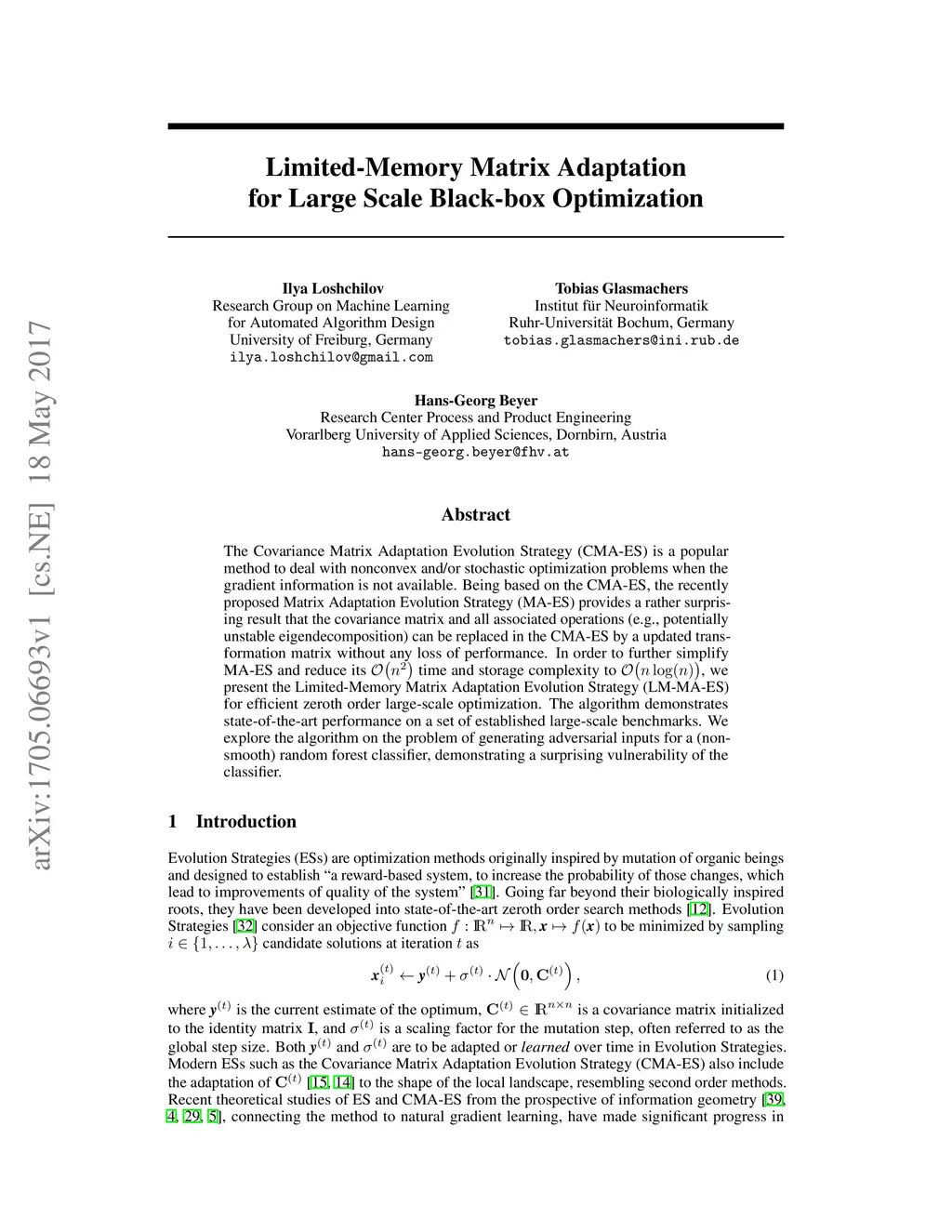 The Covariance Matrix Adaptation Evolution Strategy (CMA-ES) is a popular method to deal with nonconvex and/or stochastic optimization problems when the gradient information is not available. Being based on the CMA-ES, the recently proposed Matrix Adaptation Evolution Strategy (MA-ES) provides a rather surprising result that the covariance matrix and all associated operations (e.g., potentially unstable eigendecomposition) can be replaced in the CMA-ES by a updated transformation matrix without any loss of performance. In order to further simplify MA-ES and reduce its time and storage complexity to , we present the Limited-Memory Matrix Adaptation Evolution Strategy (LM-MA-ES) for efficient zeroth order large-scale optimization. The algorithm demonstrates state-of-the-art performance on a set of established large-scale benchmarks. We explore the algorithm on the problem of generating adversarial inputs for a (non-smooth) random forest classifier, demonstrating a surprising vulnerability of the classifier.