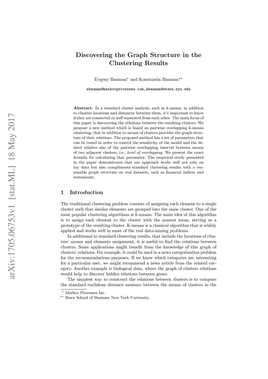 In a standard cluster analysis, such as k-means, in addition to clusters locations and distances between them, it's important to know if they are connected or well separated from each other. The main focus of this paper is discovering the relations between the resulting clusters. We propose a new method which is based on pairwise overlapping k-means clustering, that in addition to means of clusters provides the graph structure of their relations. The proposed method has a set of parameters that can be tuned in order to control the sensitivity of the model and the desired relative size of the pairwise overlapping interval between means of two adjacent clusters, i.e., level of overlapping. We present the exact formula for calculating that parameter. The empirical study presented in the paper demonstrates that our approach works well not only on toy data but also compliments standard clustering results with a reasonable graph structure on real datasets, such as financial indices and restaurants.