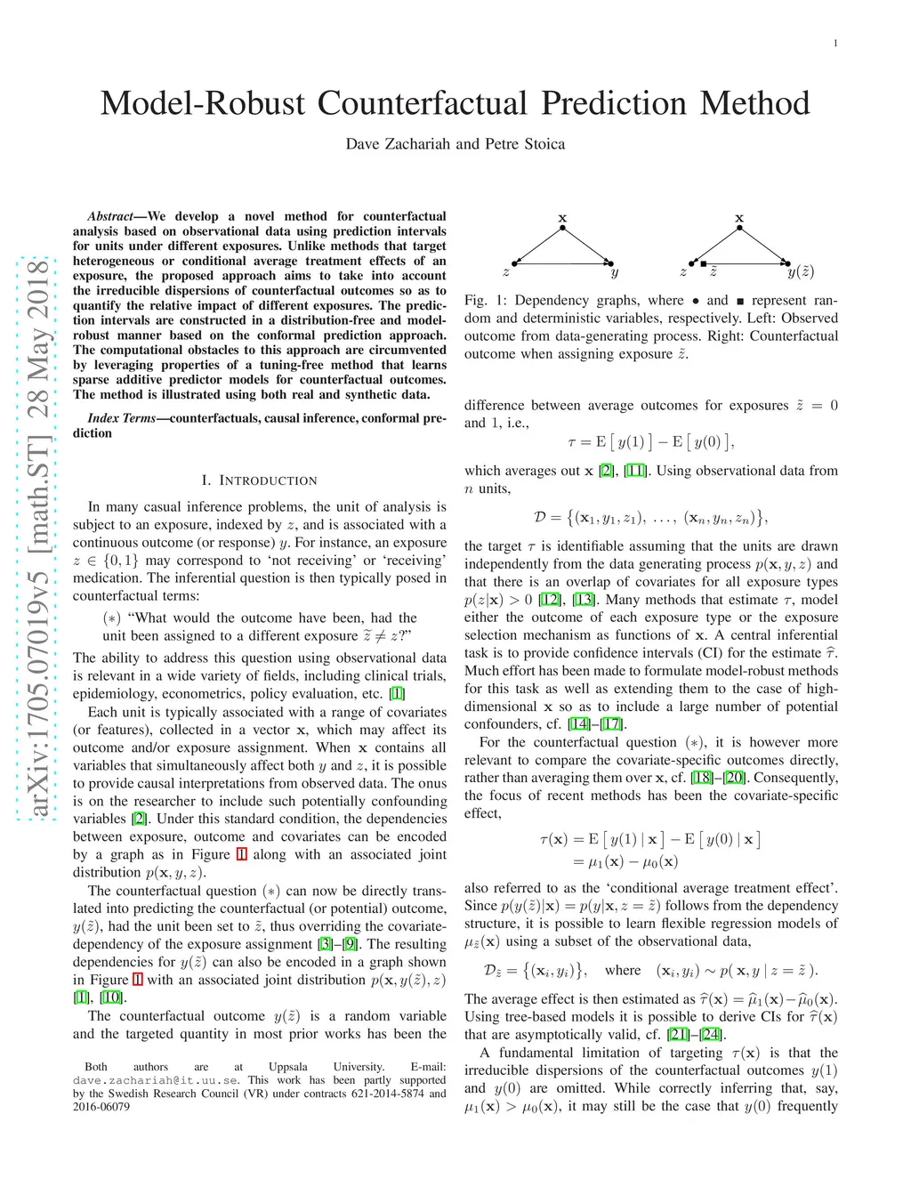 We develop a novel method for counterfactual analysis based on observational data using prediction intervals for units under different exposures. Unlike methods that target heterogeneous or conditional average treatment effects of an exposure, the proposed approach aims to take into account the irreducible dispersions of counterfactual outcomes so as to quantify the relative impact of different exposures. The prediction intervals are constructed in a distribution-free and model-robust manner based on the conformal prediction approach. The computational obstacles to this approach are circumvented by leveraging properties of a tuning-free method that learns sparse additive predictor models for counterfactual outcomes. The method is illustrated using both real and synthetic data.