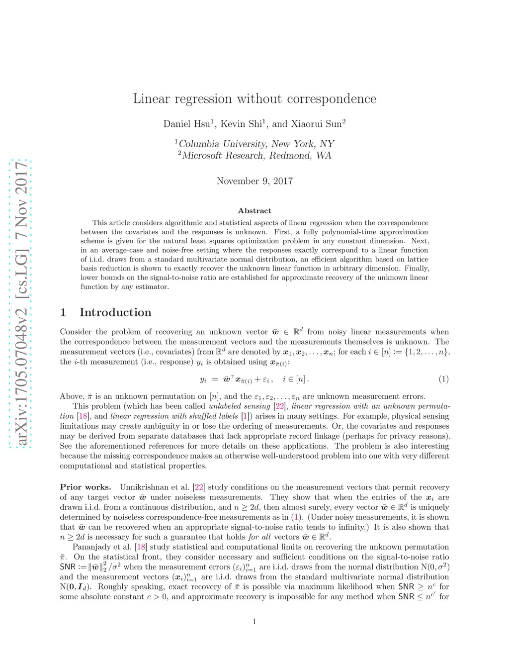 This article considers algorithmic and statistical aspects of linear regression when the correspondence between the covariates and the responses is unknown. First, a fully polynomial-time approximation scheme is given for the natural least squares optimization problem in any constant dimension. Next, in an average-case and noise-free setting where the responses exactly correspond to a linear function of i.i.d. draws from a standard multivariate normal distribution, an efficient algorithm based on lattice basis reduction is shown to exactly recover the unknown linear function in arbitrary dimension. Finally, lower bounds on the signal-to-noise ratio are established for approximate recovery of the unknown linear function by any estimator.