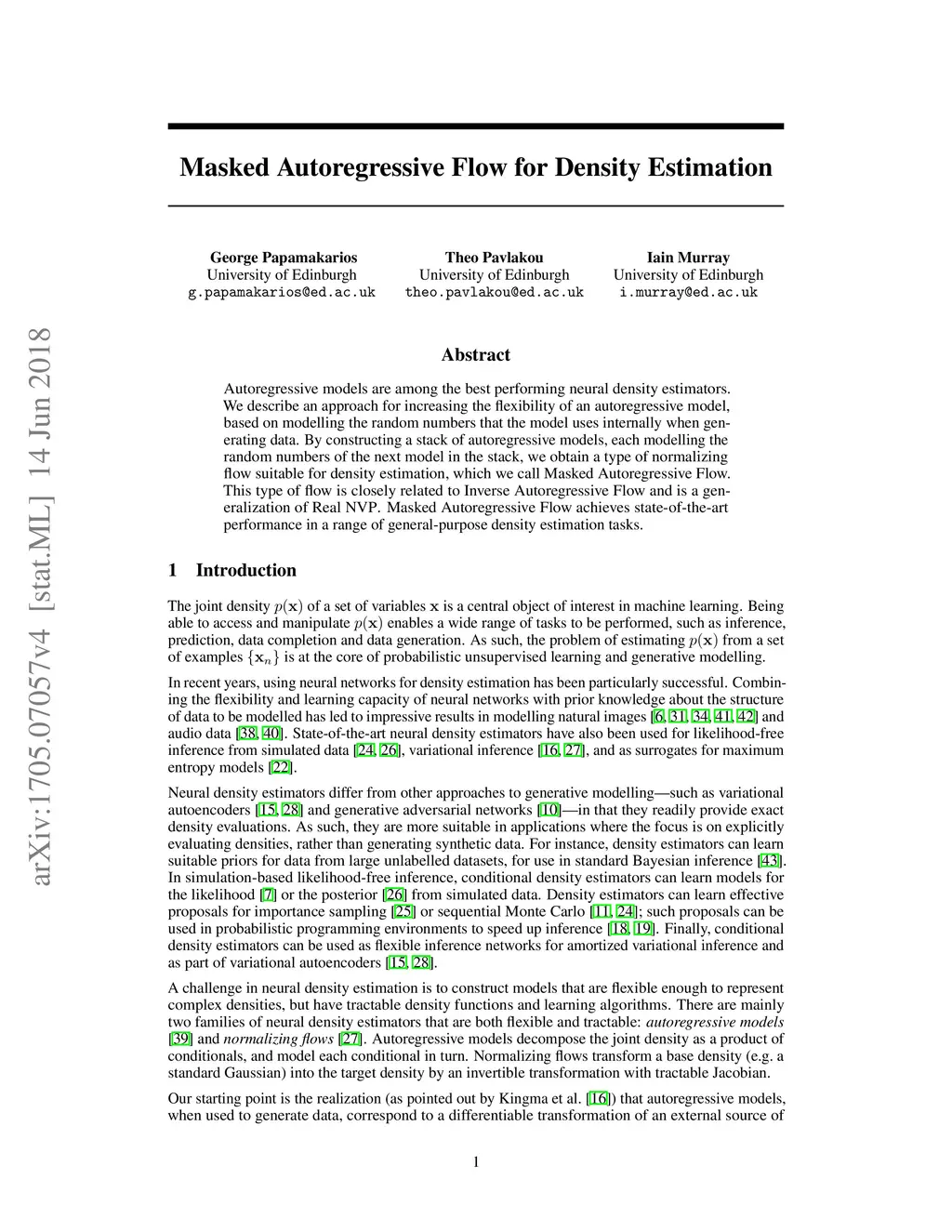 Masked Autoregressive Flow for Density Estimation