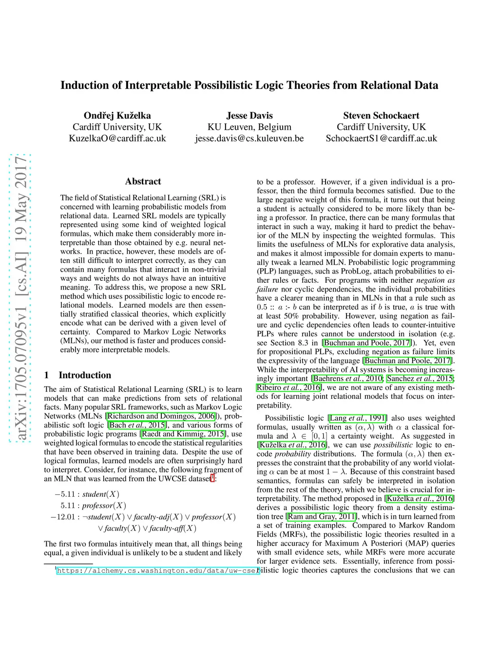 The field of Statistical Relational Learning (SRL) is concerned with learning probabilistic models from relational data. Learned SRL models are typically represented using some kind of weighted logical formulas, which make them considerably more interpretable than those obtained by e.g. neural networks. In practice, however, these models are often still difficult to interpret correctly, as they can contain many formulas that interact in non-trivial ways and weights do not always have an intuitive meaning. To address this, we propose a new SRL method which uses possibilistic logic to encode relational models. Learned models are then essentially stratified classical theories, which explicitly encode what can be derived with a given level of certainty. Compared to Markov Logic Networks (MLNs), our method is faster and produces considerably more interpretable models.