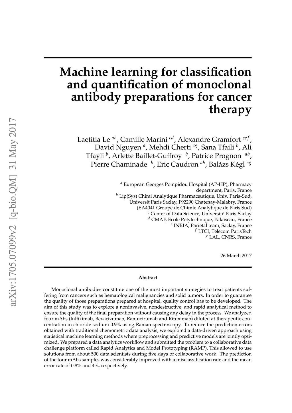 Monoclonal antibodies constitute one of the most important strategies to treat patients suffering from cancers such as hematological malignancies and solid tumors. In order to guarantee the quality of those preparations prepared at hospital, quality control has to be developed. The aim of this study was to explore a noninvasive, nondestructive, and rapid analytical method to ensure the quality of the final preparation without causing any delay in the process. We analyzed four mAbs (Inlfiximab, Bevacizumab, Ramucirumab and Rituximab) diluted at therapeutic concentration in chloride sodium 0.9% using Raman spectroscopy. To reduce the prediction errors obtained with traditional chemometric data analysis, we explored a data-driven approach using statistical machine learning methods where preprocessing and predictive models are jointly optimized. We prepared a data analytics workflow and submitted the problem to a collaborative data challenge platform called Rapid Analytics and Model Prototyping (RAMP). This allowed to use solutions from about 300 data scientists during five days of collaborative work. The prediction of the four mAbs samples was considerably improved with a misclassification rate and the mean error rate of 0.8% and 4%, respectively.