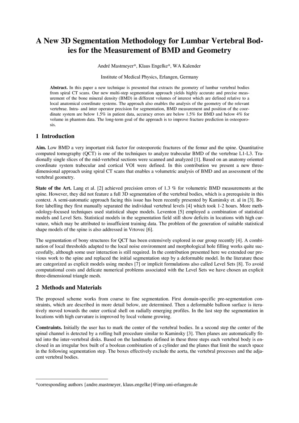 In this paper a new technique is presented that extracts the geometry of lumbar vertebral bodies from spiral CT scans. Our new multi-step segmentation approach yields highly accurate and precise measurement of the bone mineral density (BMD) in different volumes of interest which are defined relative to a local anatomical coordinate systems. The approach also enables the analysis of the geometry of the relevant vertebrae. Intra- and inter operator precision for segmentation, BMD measurement and position of the coordinate system are below 1.5% in patient data, accuracy errors are below 1.5% for BMD and below 4% for volume in phantom data. The long-term goal of the approach is to improve fracture prediction in osteoporosis.