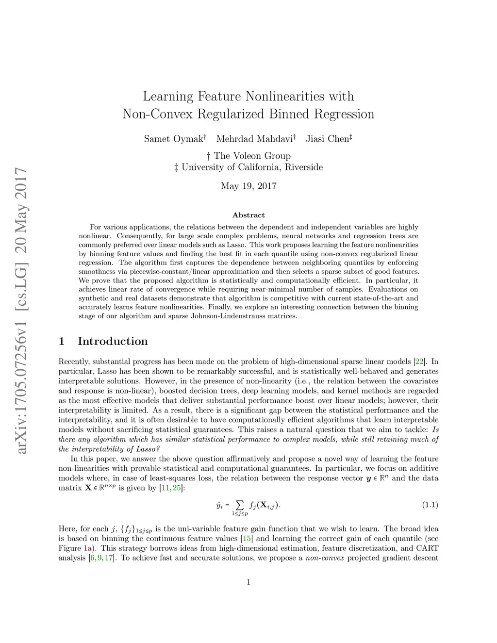 For various applications, the relations between the dependent and independent variables are highly nonlinear. Consequently, for large scale complex problems, neural networks and regression trees are commonly preferred over linear models such as Lasso. This work proposes learning the feature nonlinearities by binning feature values and finding the best fit in each quantile using non-convex regularized linear regression. The algorithm first captures the dependence between neighboring quantiles by enforcing smoothness via piecewise-constant/linear approximation and then selects a sparse subset of good features. We prove that the proposed algorithm is statistically and computationally efficient. In particular, it achieves linear rate of convergence while requiring near-minimal number of samples. Evaluations on synthetic and real datasets demonstrate that algorithm is competitive with current state-of-the-art and accurately learns feature nonlinearities. Finally, we explore an interesting connection between the binning stage of our algorithm and sparse Johnson-Lindenstrauss matrices.