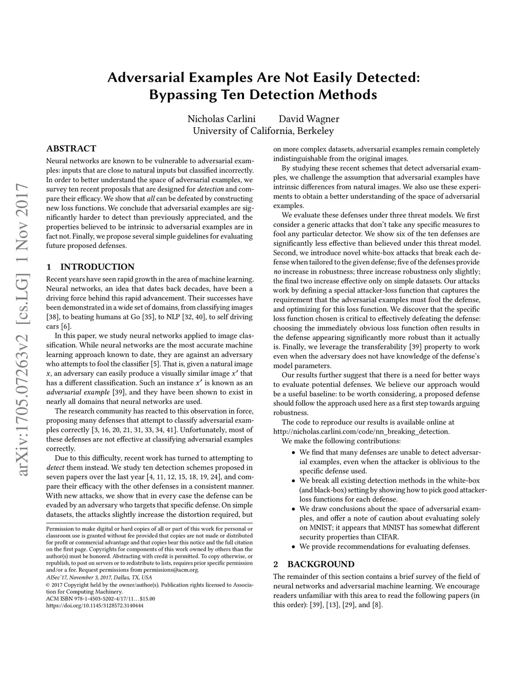 Neural networks are known to be vulnerable to adversarial examples: inputs that are close to natural inputs but classified incorrectly. In order to better understand the space of adversarial examples, we survey ten recent proposals that are designed for detection and compare their efficacy. We show that all can be defeated by constructing new loss functions. We conclude that adversarial examples are significantly harder to detect than previously appreciated, and the properties believed to be intrinsic to adversarial examples are in fact not. Finally, we propose several simple guidelines for evaluating future proposed defenses.