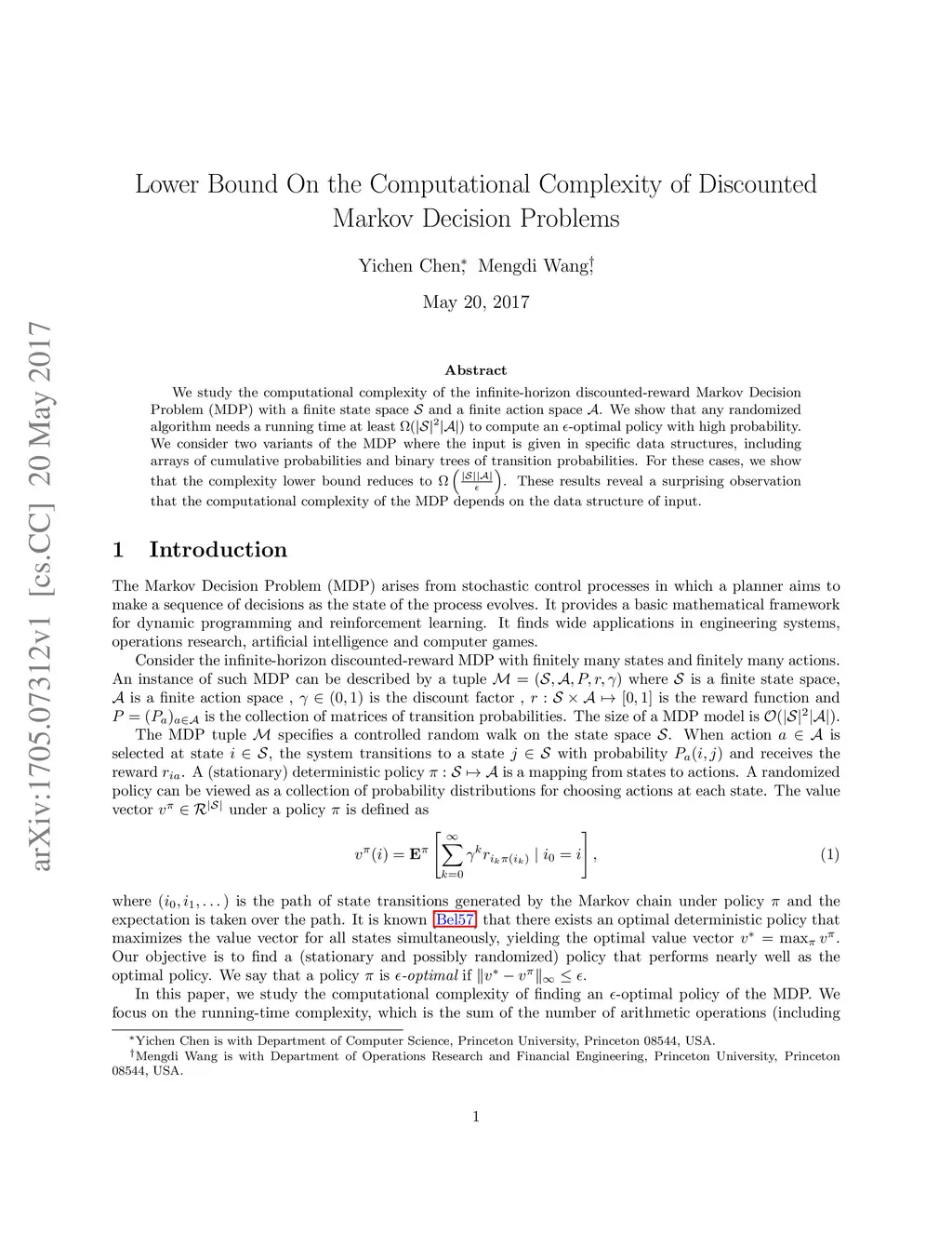 We study the computational complexity of the infinite-horizon discounted-reward Markov Decision Problem (MDP) with a finite state space and a finite action space . We show that any randomized algorithm needs a running time at least to compute an -optimal policy with high probability. We consider two variants of the MDP where the input is given in specific data structures, including arrays of cumulative probabilities and binary trees of transition probabilities. For these cases, we show that the complexity lower bound reduces to . These results reveal a surprising observation that the computational complexity of the MDP depends on the data structure of input.