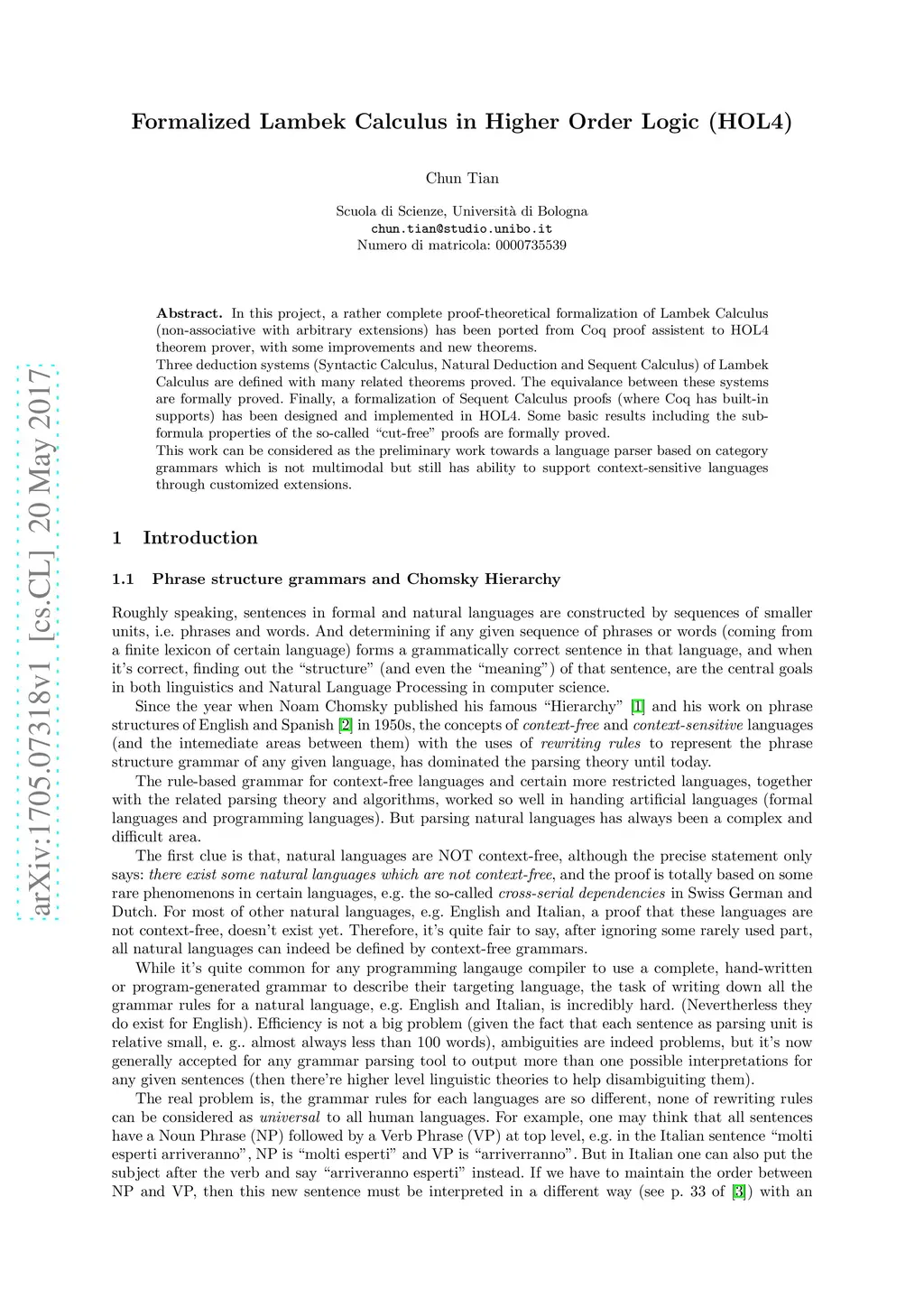 In this project, a rather complete proof-theoretical formalization of Lambek Calculus (non-associative with arbitrary extensions) has been ported from Coq proof assistent to HOL4 theorem prover, with some improvements and new theorems. Three deduction systems (Syntactic Calculus, Natural Deduction and Sequent Calculus) of Lambek Calculus are defined with many related theorems proved. The equivalance between these systems are formally proved. Finally, a formalization of Sequent Calculus proofs (where Coq has built-in supports) has been designed and implemented in HOL4. Some basic results including the sub-formula properties of the so-called "cut-free" proofs are formally proved. This work can be considered as the preliminary work towards a language parser based on category grammars which is not multimodal but still has ability to support context-sensitive languages through customized extensions.