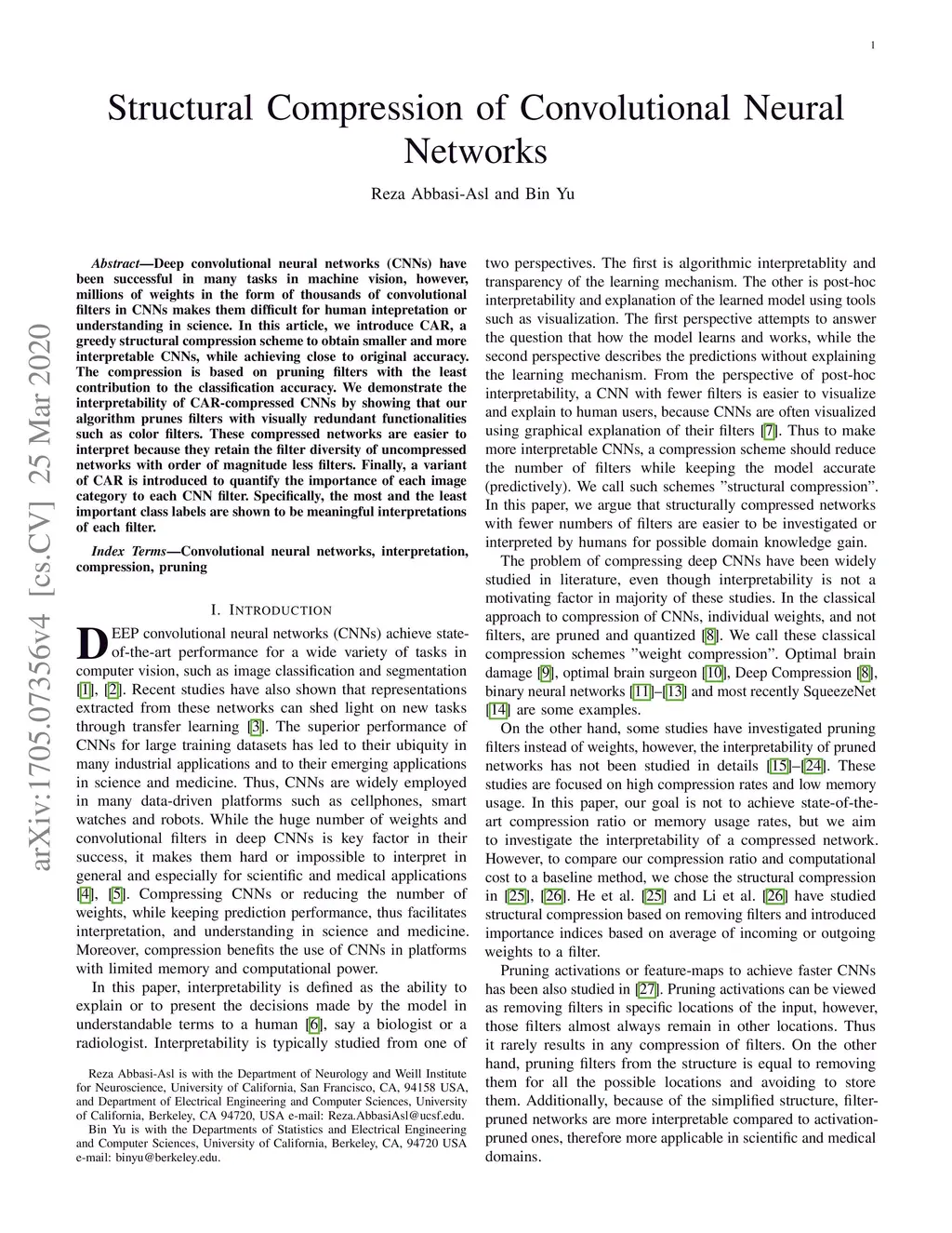 Deep convolutional neural networks (CNNs) have been successful in many tasks in machine vision, however, millions of weights in the form of thousands of convolutional filters in CNNs makes them difficult for human intepretation or understanding in science. In this article, we introduce CAR, a greedy structural compression scheme to obtain smaller and more interpretable CNNs, while achieving close to original accuracy. The compression is based on pruning filters with the least contribution to the classification accuracy. We demonstrate the interpretability of CAR-compressed CNNs by showing that our algorithm prunes filters with visually redundant functionalities such as color filters. These compressed networks are easier to interpret because they retain the filter diversity of uncompressed networks with order of magnitude less filters. Finally, a variant of CAR is introduced to quantify the importance of each image category to each CNN filter. Specifically, the most and the least important class labels are shown to be meaningful interpretations of each filter.