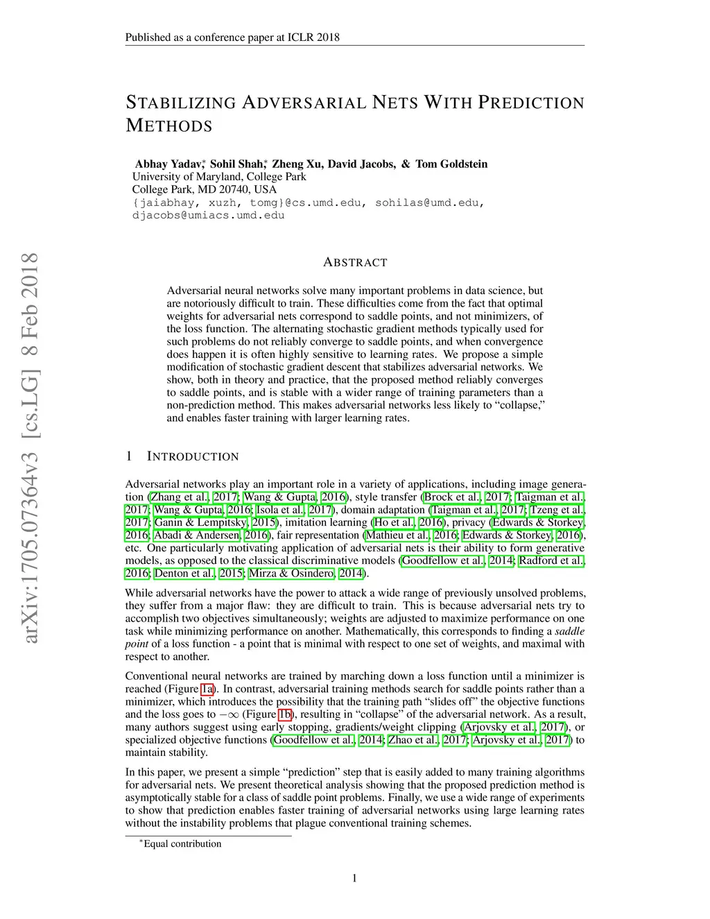 Adversarial neural networks solve many important problems in data science, but are notoriously difficult to train. These difficulties come from the fact that optimal weights for adversarial nets correspond to saddle points, and not minimizers, of the loss function. The alternating stochastic gradient methods typically used for such problems do not reliably converge to saddle points, and when convergence does happen it is often highly sensitive to learning rates. We propose a simple modification of stochastic gradient descent that stabilizes adversarial networks. We show, both in theory and practice, that the proposed method reliably converges to saddle points, and is stable with a wider range of training parameters than a non-prediction method. This makes adversarial networks less likely to "collapse," and enables faster training with larger learning rates.