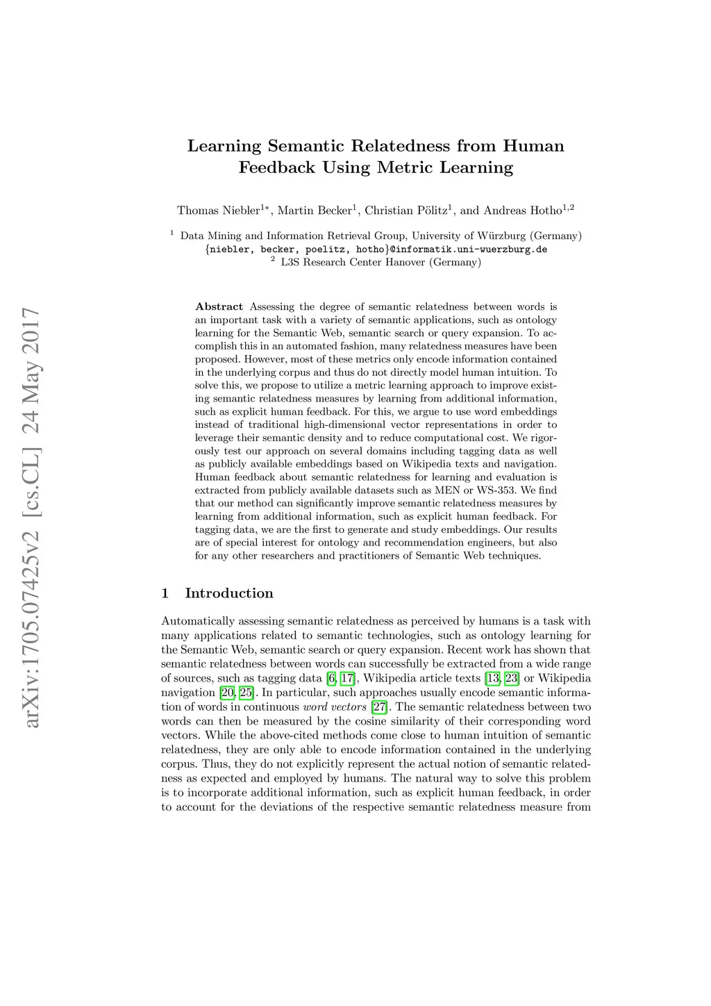 Learning Semantic Relatedness From Human Feedback Using Metric Learning