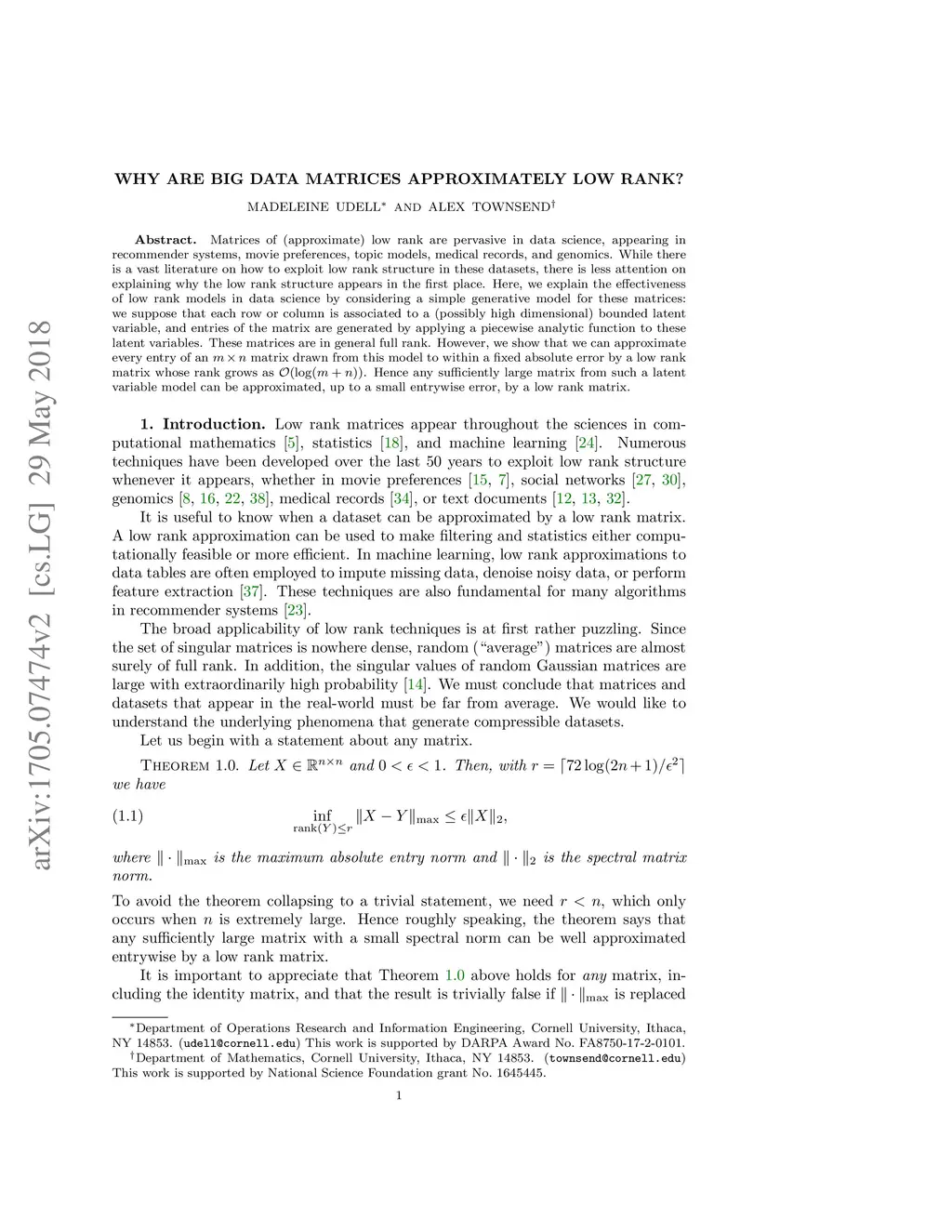 Matrices of (approximate) low rank are pervasive in data science, appearing in recommender systems, movie preferences, topic models, medical records, and genomics. While there is a vast literature on how to exploit low rank structure in these datasets, there is less attention on explaining why the low rank structure appears in the first place. Here, we explain the effectiveness of low rank models in data science by considering a simple generative model for these matrices: we suppose that each row or column is associated to a (possibly high dimensional) bounded latent variable, and entries of the matrix are generated by applying a piecewise analytic function to these latent variables. These matrices are in general full rank. However, we show that we can approximate every entry of an matrix drawn from this model to within a fixed absolute error by a low rank matrix whose rank grows as . Hence any sufficiently large matrix from such a latent variable model can be approximated, up to a small entrywise error, by a low rank matrix.