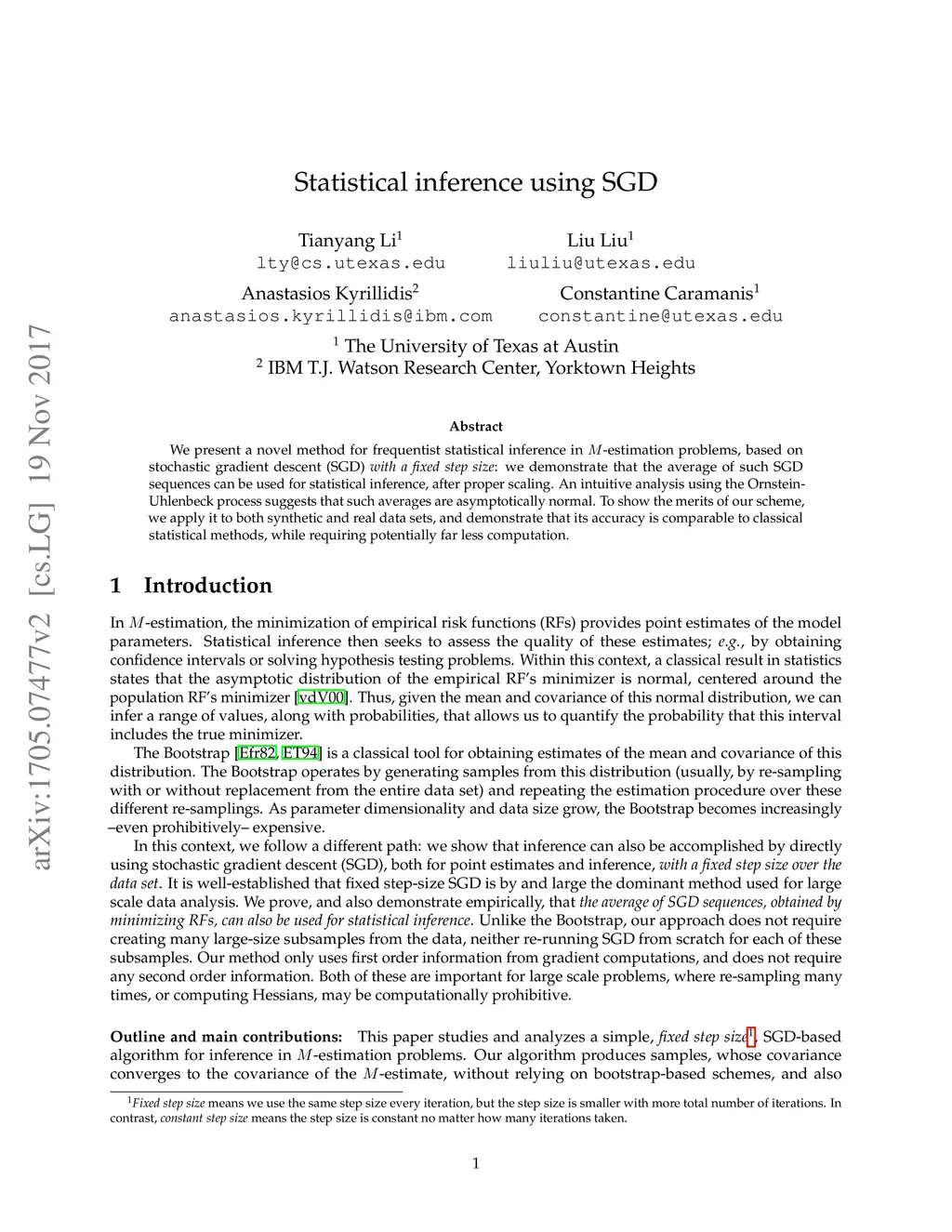 We present a novel method for frequentist statistical inference in -estimation problems, based on stochastic gradient descent (SGD) with a fixed step size: we demonstrate that the average of such SGD sequences can be used for statistical inference, after proper scaling. An intuitive analysis using the Ornstein-Uhlenbeck process suggests that such averages are asymptotically normal. From a practical perspective, our SGD-based inference procedure is a first order method, and is well-suited for large scale problems. To show its merits, we apply it to both synthetic and real datasets, and demonstrate that its accuracy is comparable to classical statistical methods, while requiring potentially far less computation.