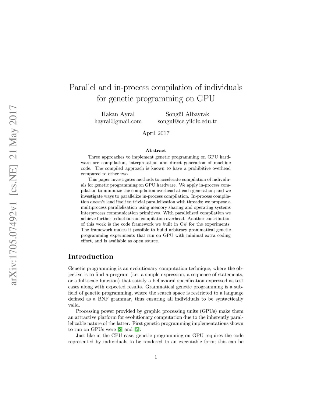 Three approaches to implement genetic programming on GPU hardware are compilation, interpretation and direct generation of machine code. The compiled approach is known to have a prohibitive overhead compared to other two. This paper investigates methods to accelerate compilation of individuals for genetic programming on GPU hardware. We apply in-process compilation to minimize the compilation overhead at each generation; and we investigate ways to parallelize in-process compilation. In-process compilation doesn't lend itself to trivial parallelization with threads; we propose a multiprocess parallelization using memory sharing and operating systems interprocess communication primitives. With parallelized compilation we achieve further reductions on compilation overhead. Another contribution of this work is the code framework we built in C# for the experiments. The framework makes it possible to build arbitrary grammatical genetic programming experiments that run on GPU with minimal extra coding effort, and is available as open source.