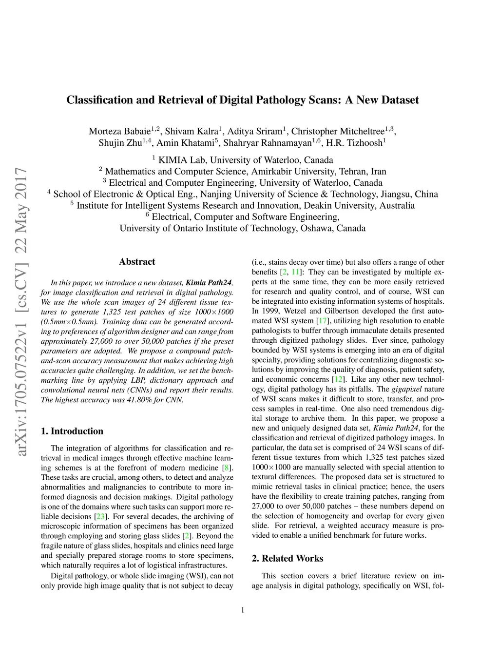 In this paper, we introduce a new dataset, \textbf{Kimia Path24}, for image classification and retrieval in digital pathology. We use the whole scan images of 24 different tissue textures to generate 1,325 test patches of size 10001000 (0.5mm0.5mm). Training data can be generated according to preferences of algorithm designer and can range from approximately 27,000 to over 50,000 patches if the preset parameters are adopted. We propose a compound patch-and-scan accuracy measurement that makes achieving high accuracies quite challenging. In addition, we set the benchmarking line by applying LBP, dictionary approach and convolutional neural nets (CNNs) and report their results. The highest accuracy was 41.80\% for CNN.