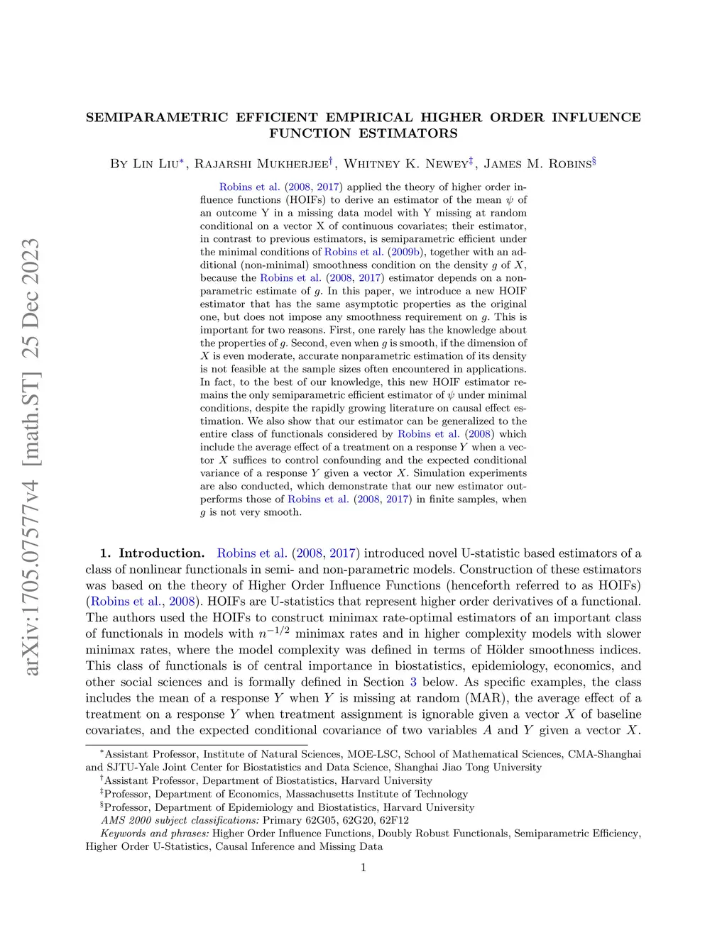 Robins et al. (2008, 2017) applied the theory of higher order influence functions (HOIFs) to derive an estimator of the mean of an outcome Y in a missing data model with Y missing at random conditional on a vector X of continuous covariates; their estimator, in contrast to previous estimators, is semiparametric efficient under the minimal conditions of Robins et al. (2009b), together with an additional (non-minimal) smoothness condition on the density g of X, because the Robins et al. (2008, 2017) estimator depends on a nonparametric estimate of g. In this paper, we introduce a new HOIF estimator that has the same asymptotic properties as the original one, but does not impose any smoothness requirement on g. This is important for two reasons. First, one rarely has the knowledge about the properties of g. Second, even when g is smooth, if the dimension of X is even moderate, accurate nonparametric estimation of its density is not feasible at the sample sizes often encountered in applications. In fact, to the best of our knowledge, this new HOIF estimator remains the only semiparametric efficient estimator of under minimal conditions, despite the rapidly growing literature on causal effect estimation. We also show that our estimator can be generalized to the entire class of functionals considered by Robins et al. (2008) which include the average effect of a treatment on a response Y when a vector X suffices to control confounding and the expected conditional variance of a response Y given a vector X. Simulation experiments are also conducted, which demonstrate that our new estimator outperforms those of Robins et al. (2008, 2017) in finite samples, when g is not very smooth.