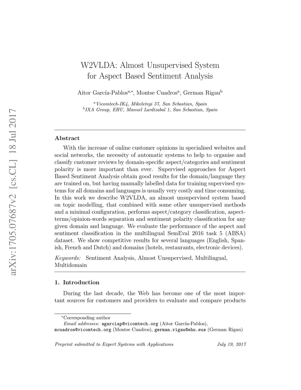 W2VLDA: Almost Unsupervised System for Aspect Based Sentiment Analysis