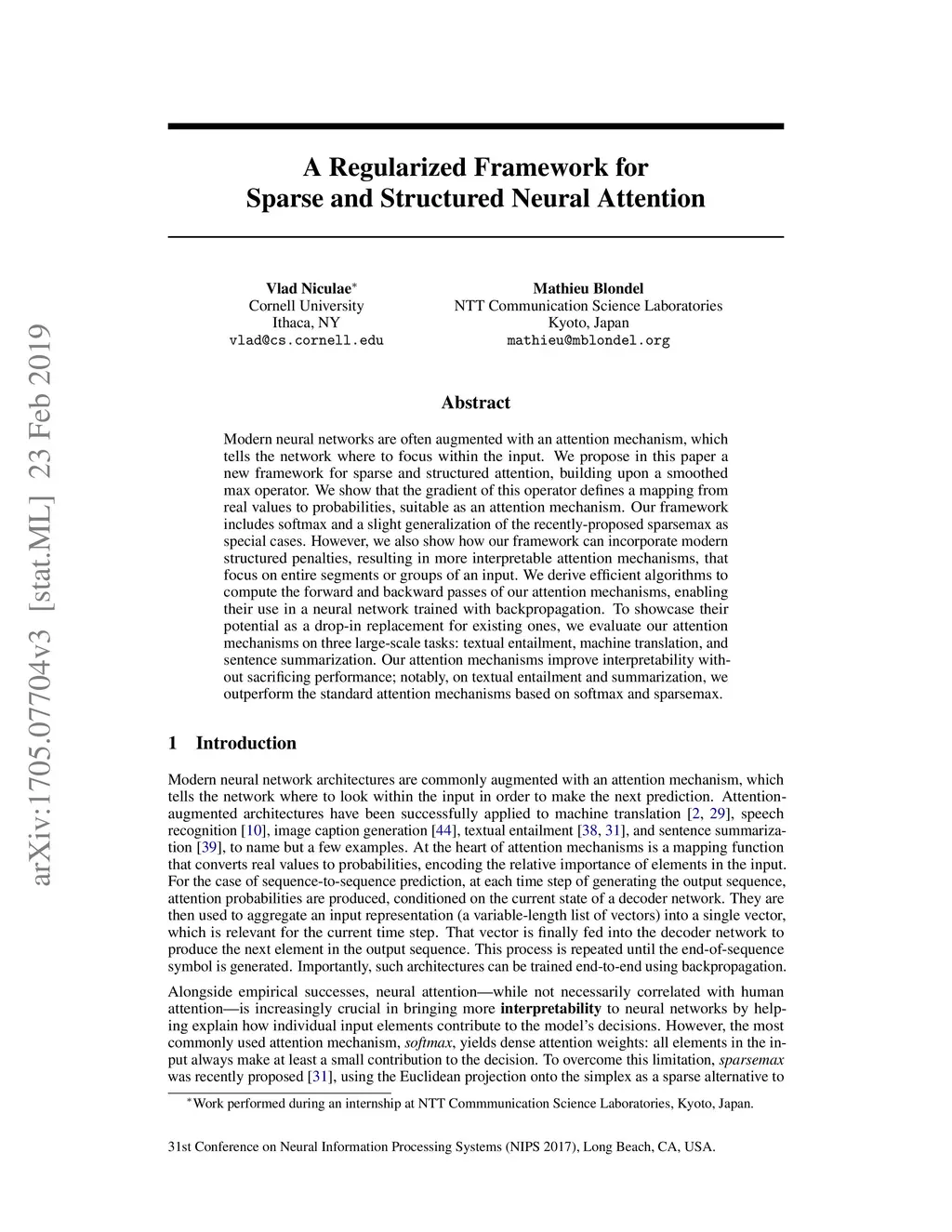Modern neural networks are often augmented with an attention mechanism, which tells the network where to focus within the input. We propose in this paper a new framework for sparse and structured attention, building upon a smoothed max operator. We show that the gradient of this operator defines a mapping from real values to probabilities, suitable as an attention mechanism. Our framework includes softmax and a slight generalization of the recently-proposed sparsemax as special cases. However, we also show how our framework can incorporate modern structured penalties, resulting in more interpretable attention mechanisms, that focus on entire segments or groups of an input. We derive efficient algorithms to compute the forward and backward passes of our attention mechanisms, enabling their use in a neural network trained with backpropagation. To showcase their potential as a drop-in replacement for existing ones, we evaluate our attention mechanisms on three large-scale tasks: textual entailment, machine translation, and sentence summarization. Our attention mechanisms improve interpretability without sacrificing performance; notably, on textual entailment and summarization, we outperform the standard attention mechanisms based on softmax and sparsemax.