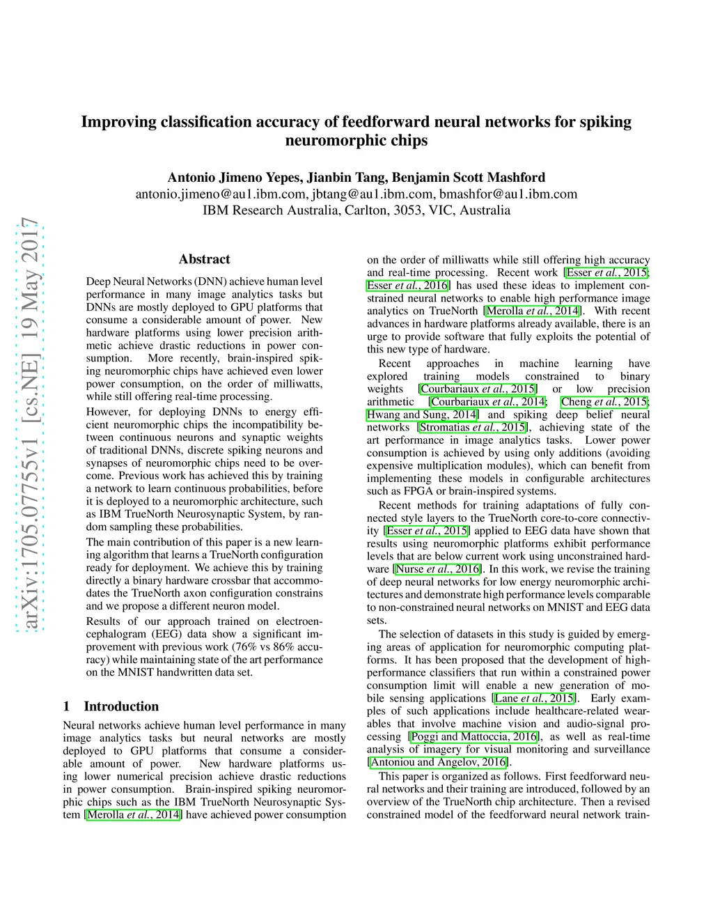 Deep Neural Networks (DNN) achieve human level performance in many image analytics tasks but DNNs are mostly deployed to GPU platforms that consume a considerable amount of power. New hardware platforms using lower precision arithmetic achieve drastic reductions in power consumption. More recently, brain-inspired spiking neuromorphic chips have achieved even lower power consumption, on the order of milliwatts, while still offering real-time processing. However, for deploying DNNs to energy efficient neuromorphic chips the incompatibility between continuous neurons and synaptic weights of traditional DNNs, discrete spiking neurons and synapses of neuromorphic chips need to be overcome. Previous work has achieved this by training a network to learn continuous probabilities, before it is deployed to a neuromorphic architecture, such as IBM TrueNorth Neurosynaptic System, by random sampling these probabilities. The main contribution of this paper is a new learning algorithm that learns a TrueNorth configuration ready for deployment. We achieve this by training directly a binary hardware crossbar that accommodates the TrueNorth axon configuration constrains and we propose a different neuron model. Results of our approach trained on electroencephalogram (EEG) data show a significant improvement with previous work (76% vs 86% accuracy) while maintaining state of the art performance on the MNIST handwritten data set.