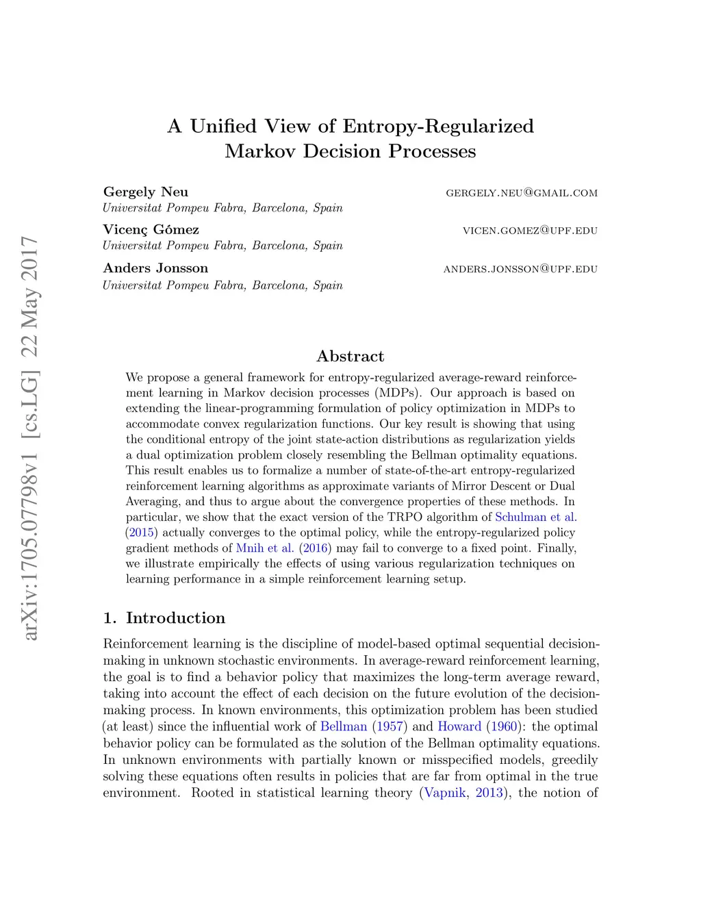 We propose a general framework for entropy-regularized average-reward reinforcement learning in Markov decision processes (MDPs). Our approach is based on extending the linear-programming formulation of policy optimization in MDPs to accommodate convex regularization functions. Our key result is showing that using the conditional entropy of the joint state-action distributions as regularization yields a dual optimization problem closely resembling the Bellman optimality equations. This result enables us to formalize a number of state-of-the-art entropy-regularized reinforcement learning algorithms as approximate variants of Mirror Descent or Dual Averaging, and thus to argue about the convergence properties of these methods. In particular, we show that the exact version of the TRPO algorithm of Schulman et al. (2015) actually converges to the optimal policy, while the entropy-regularized policy gradient methods of Mnih et al. (2016) may fail to converge to a fixed point. Finally, we illustrate empirically the effects of using various regularization techniques on learning performance in a simple reinforcement learning setup.