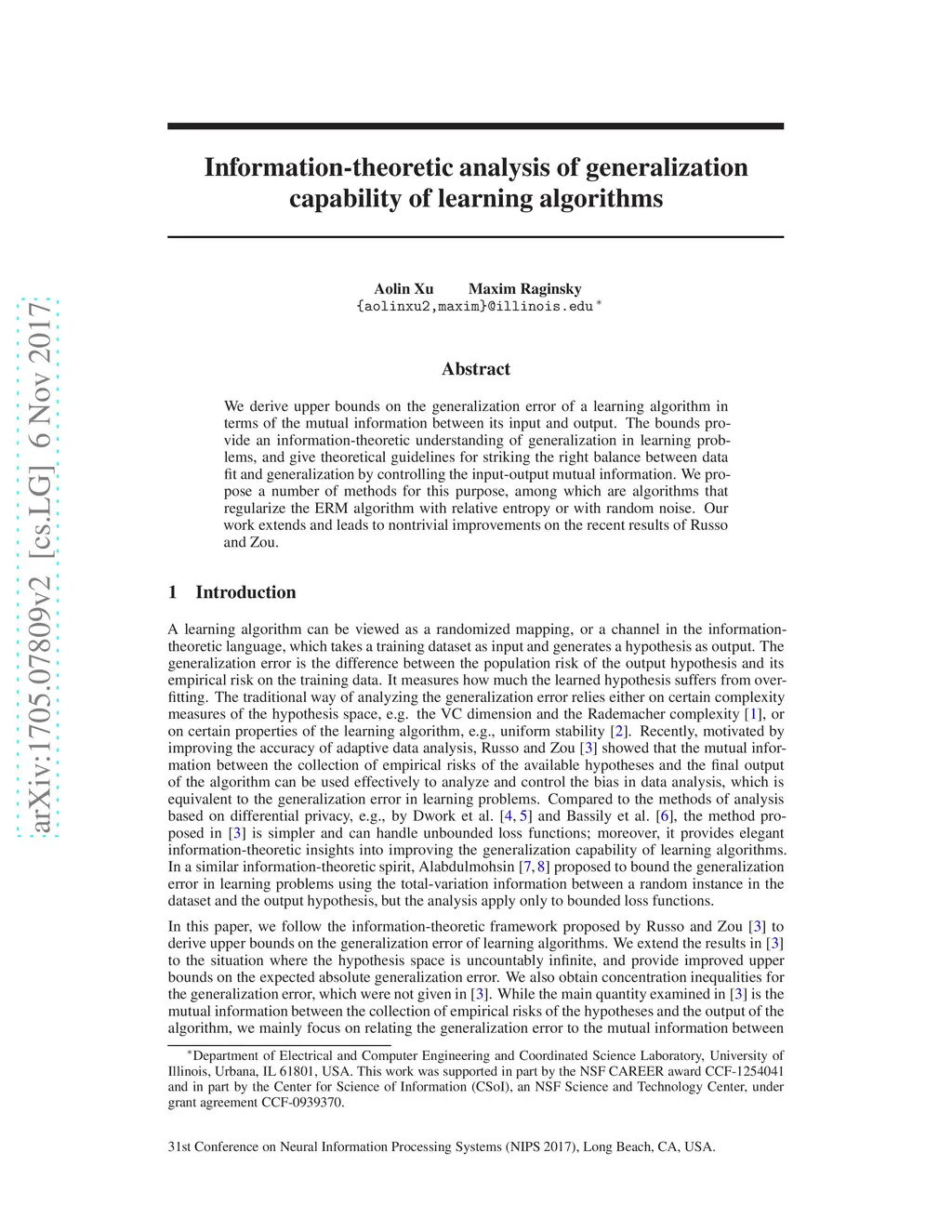 We derive upper bounds on the generalization error of a learning algorithm in terms of the mutual information between its input and output. The bounds provide an information-theoretic understanding of generalization in learning problems, and give theoretical guidelines for striking the right balance between data fit and generalization by controlling the input-output mutual information. We propose a number of methods for this purpose, among which are algorithms that regularize the ERM algorithm with relative entropy or with random noise. Our work extends and leads to nontrivial improvements on the recent results of Russo and Zou.