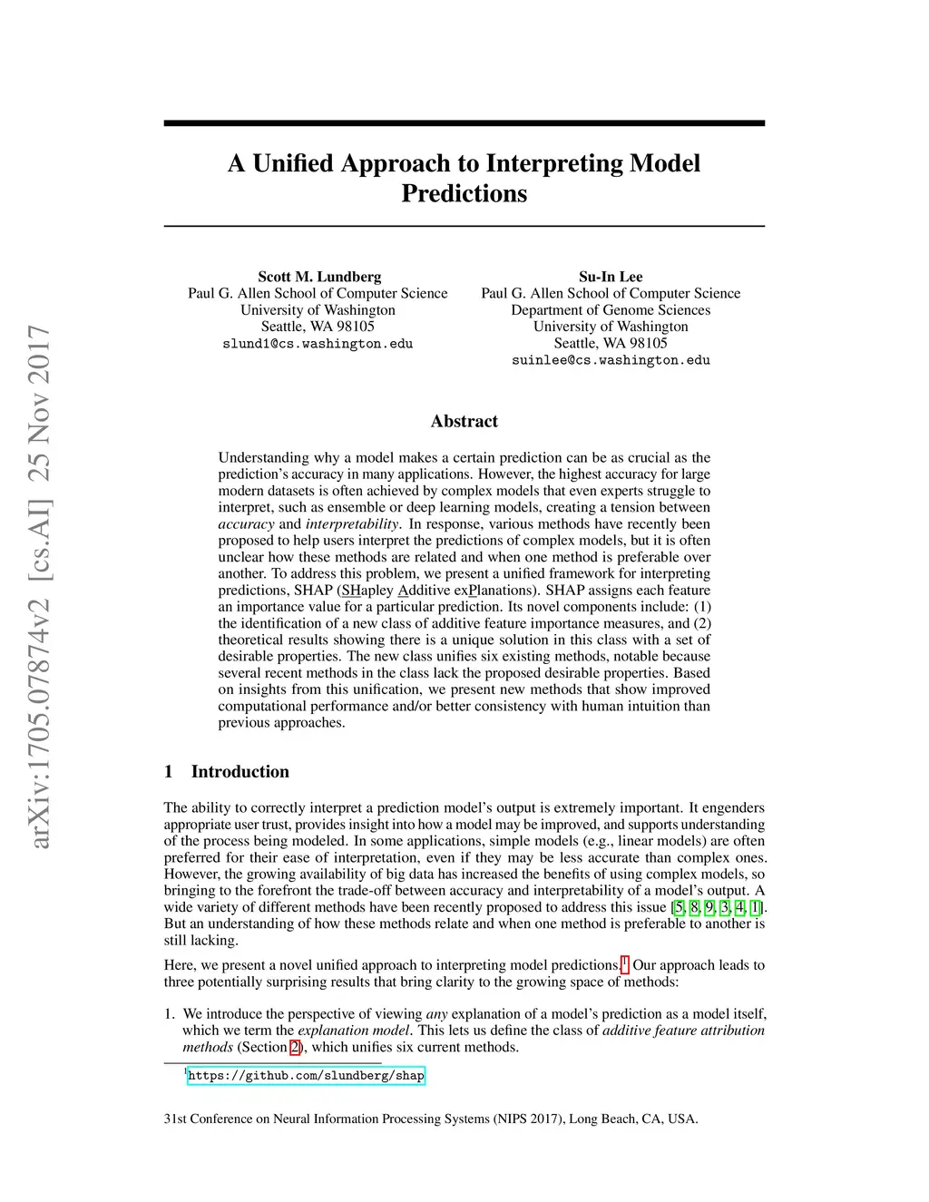 Understanding why a model makes a certain prediction can be as crucial as the prediction's accuracy in many applications. However, the highest accuracy for large modern datasets is often achieved by complex models that even experts struggle to interpret, such as ensemble or deep learning models, creating a tension between accuracy and interpretability. In response, various methods have recently been proposed to help users interpret the predictions of complex models, but it is often unclear how these methods are related and when one method is preferable over another. To address this problem, we present a unified framework for interpreting predictions, SHAP (SHapley Additive exPlanations). SHAP assigns each feature an importance value for a particular prediction. Its novel components include: (1) the identification of a new class of additive feature importance measures, and (2) theoretical results showing there is a unique solution in this class with a set of desirable properties. The new class unifies six existing methods, notable because several recent methods in the class lack the proposed desirable properties. Based on insights from this unification, we present new methods that show improved computational performance and/or better consistency with human intuition than previous approaches.