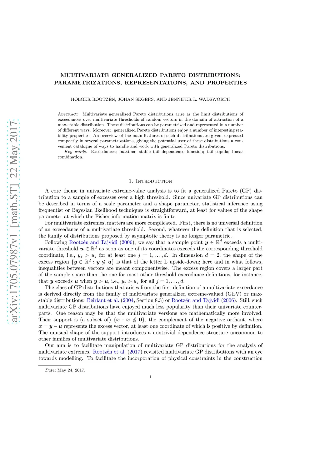 Multivariate generalized Pareto distributions arise as the limit distributions of exceedances over multivariate thresholds of random vectors in the domain of attraction of a max-stable distribution. These distributions can be parametrized and represented in a number of different ways. Moreover, generalized Pareto distributions enjoy a number of interesting stability properties. An overview of the main features of such distributions are given, expressed compactly in several parametrizations, giving the potential user of these distributions a convenient catalogue of ways to handle and work with generalized Pareto distributions.