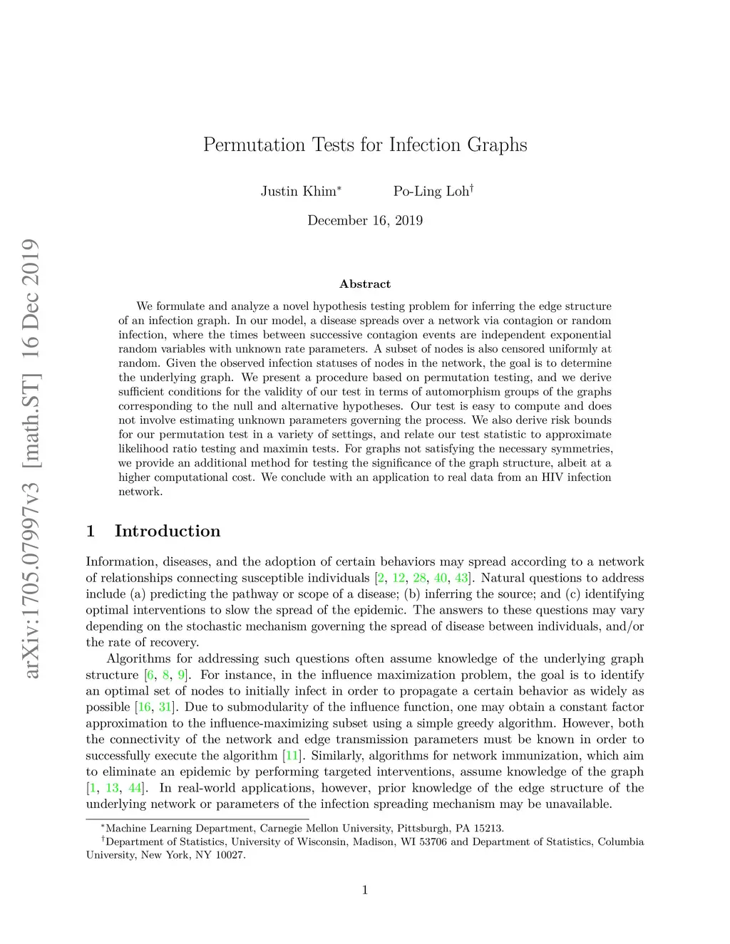 We formulate and analyze a novel hypothesis testing problem for inferring the edge structure of an infection graph. In our model, a disease spreads over a network via contagion or random infection, where the random variables governing the rates of contracting the disease from neighbors or random infection are independent exponential random variables with unknown rate parameters. A subset of nodes is also censored uniformly at random. Given the statuses of nodes in the network, the goal is to determine the underlying graph. We present a procedure based on permutation testing, and we derive sufficient conditions for the validity of our test in terms of automorphism groups of the graphs corresponding to the null and alternative hypotheses. Further, the test is valid more generally for infection processes satisfying a basic symmetry condition. Our test is easy to compute and does not involve estimating unknown parameters governing the process. We also derive risk bounds for our permutation test in a variety of settings, and motivate our test statistic in terms of approximate equivalence to likelihood ratio testing and maximin tests. We conclude with an application to real data from an HIV infection network.
