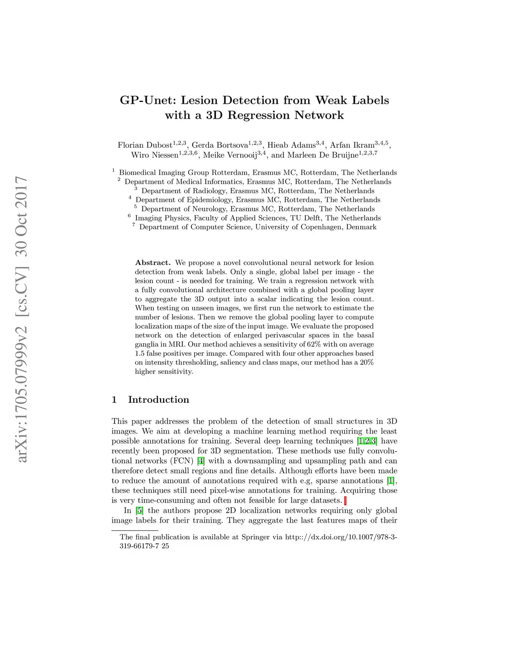 GP-Unet: Lesion Detection from Weak Labels with a 3D Regression Network