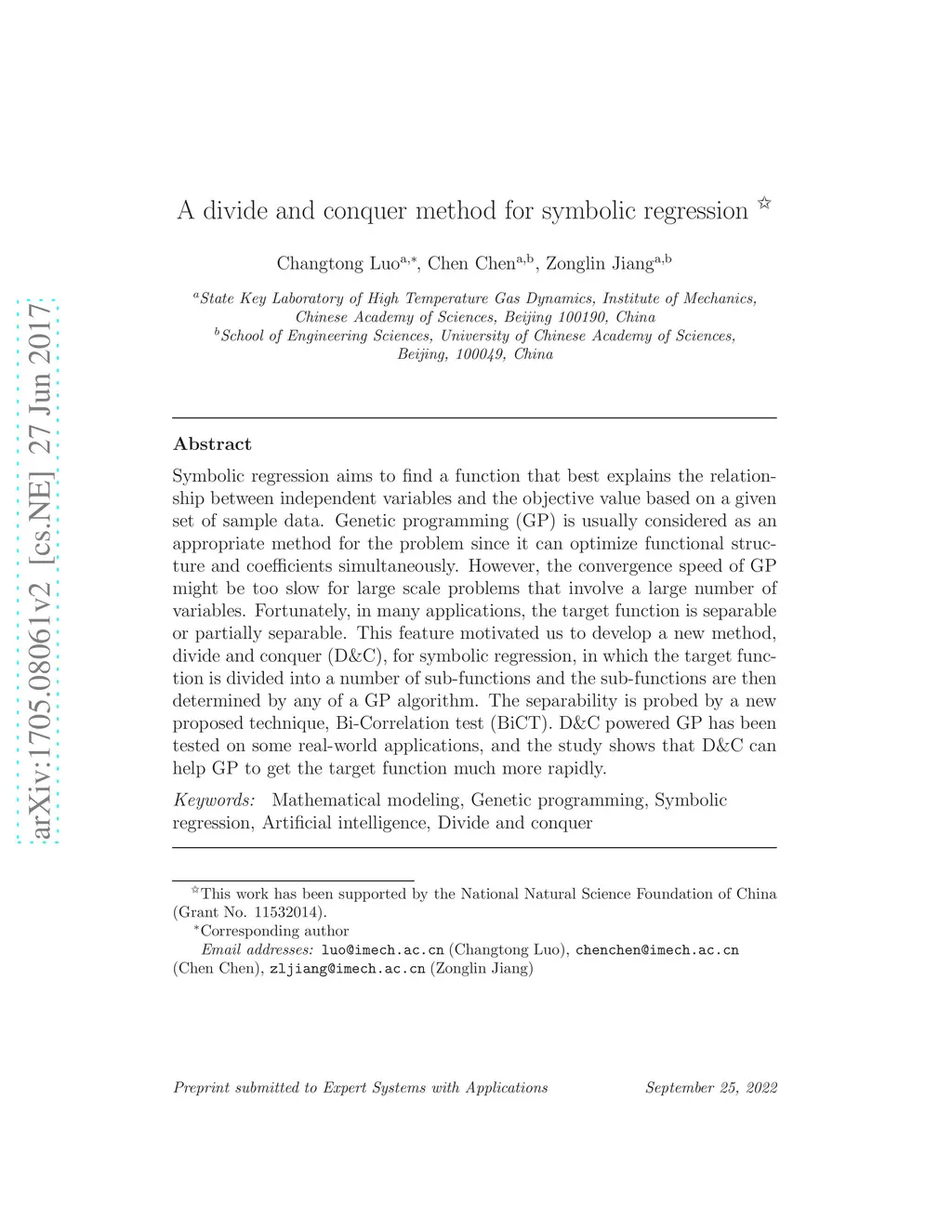 Symbolic regression aims to find a function that best explains the relationship between independent variables and the objective value based on a given set of sample data. Genetic programming (GP) is usually considered as an appropriate method for the problem since it can optimize functional structure and coefficients simultaneously. However, the convergence speed of GP might be too slow for large scale problems that involve a large number of variables. Fortunately, in many applications, the target function is separable or partially separable. This feature motivated us to develop a new method, divide and conquer (D&C), for symbolic regression, in which the target function is divided into a number of sub-functions and the sub-functions are then determined by any of a GP algorithm. The separability is probed by a new proposed technique, Bi-Correlation test (BiCT). D&C powered GP has been tested on some real-world applications, and the study shows that D&C can help GP to get the target function much more rapidly.