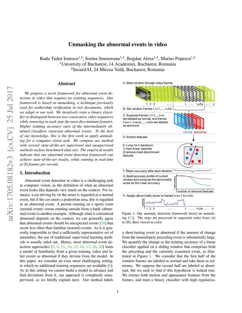 We propose a novel framework for abnormal event detection in video that requires no training sequences. Our framework is based on unmasking, a technique previously used for authorship verification in text documents, which we adapt to our task. We iteratively train a binary classifier to distinguish between two consecutive video sequences while removing at each step the most discriminant features. Higher training accuracy rates of the intermediately obtained classifiers represent abnormal events. To the best of our knowledge, this is the first work to apply unmasking for a computer vision task. We compare our method with several state-of-the-art supervised and unsupervised methods on four benchmark data sets. The empirical results indicate that our abnormal event detection framework can achieve state-of-the-art results, while running in real-time at 20 frames per second.