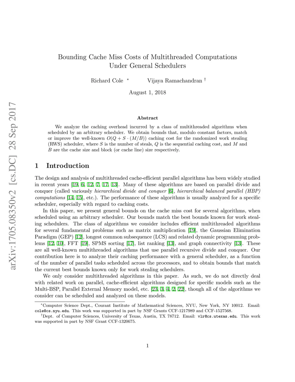 We analyze the caching overhead incurred by a class of multithreaded algorithms when scheduled by an arbitrary scheduler. We obtain bounds that match or improve upon the well-known caching cost for the randomized work stealing (RWS) scheduler, where is the number of steals, is the sequential caching cost, and and are the cache size and block (or cache line) size respectively.