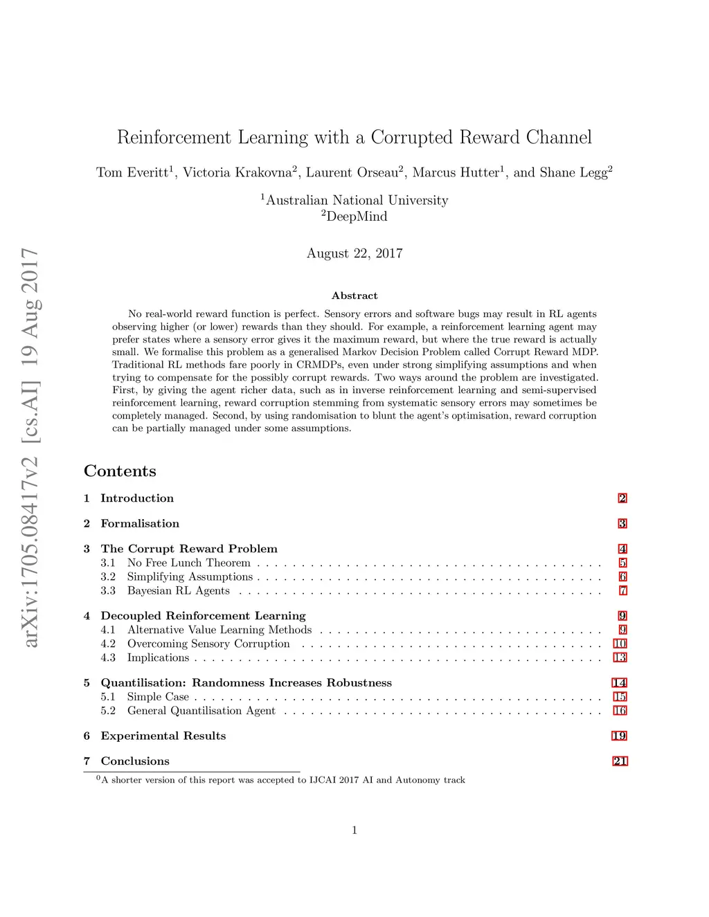 No real-world reward function is perfect. Sensory errors and software bugs may result in RL agents observing higher (or lower) rewards than they should. For example, a reinforcement learning agent may prefer states where a sensory error gives it the maximum reward, but where the true reward is actually small. We formalise this problem as a generalised Markov Decision Problem called Corrupt Reward MDP. Traditional RL methods fare poorly in CRMDPs, even under strong simplifying assumptions and when trying to compensate for the possibly corrupt rewards. Two ways around the problem are investigated. First, by giving the agent richer data, such as in inverse reinforcement learning and semi-supervised reinforcement learning, reward corruption stemming from systematic sensory errors may sometimes be completely managed. Second, by using randomisation to blunt the agent's optimisation, reward corruption can be partially managed under some assumptions.