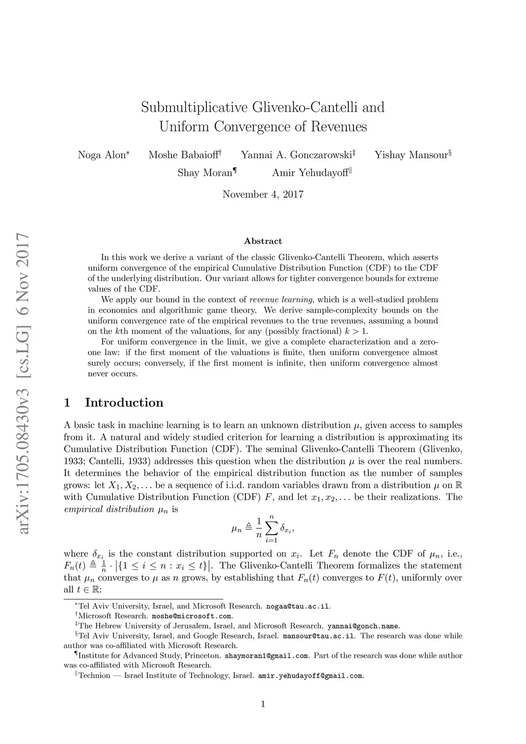 In this work we derive a variant of the classic Glivenko-Cantelli Theorem, which asserts uniform convergence of the empirical Cumulative Distribution Function (CDF) to the CDF of the underlying distribution. Our variant allows for tighter convergence bounds for extreme values of the CDF. We apply our bound in the context of revenue learning, which is a well-studied problem in economics and algorithmic game theory. We derive sample-complexity bounds on the uniform convergence rate of the empirical revenues to the true revenues, assuming a bound on the th moment of the valuations, for any (possibly fractional) . For uniform convergence in the limit, we give a complete characterization and a zero-one law: if the first moment of the valuations is finite, then uniform convergence almost surely occurs; conversely, if the first moment is infinite, then uniform convergence almost never occurs.