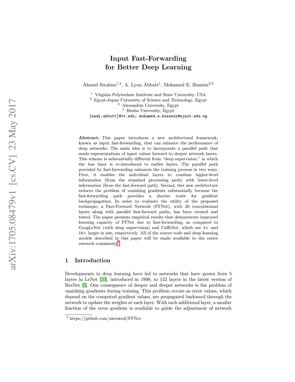 This paper introduces a new architectural framework, known as input fast-forwarding, that can enhance the performance of deep networks. The main idea is to incorporate a parallel path that sends representations of input values forward to deeper network layers. This scheme is substantially different from "deep supervision" in which the loss layer is re-introduced to earlier layers. The parallel path provided by fast-forwarding enhances the training process in two ways. First, it enables the individual layers to combine higher-level information (from the standard processing path) with lower-level information (from the fast-forward path). Second, this new architecture reduces the problem of vanishing gradients substantially because the fast-forwarding path provides a shorter route for gradient backpropagation. In order to evaluate the utility of the proposed technique, a Fast-Forward Network (FFNet), with 20 convolutional layers along with parallel fast-forward paths, has been created and tested. The paper presents empirical results that demonstrate improved learning capacity of FFNet due to fast-forwarding, as compared to GoogLeNet (with deep supervision) and CaffeNet, which are 4x and 18x larger in size, respectively. All of the source code and deep learning models described in this paper will be made available to the entire research community