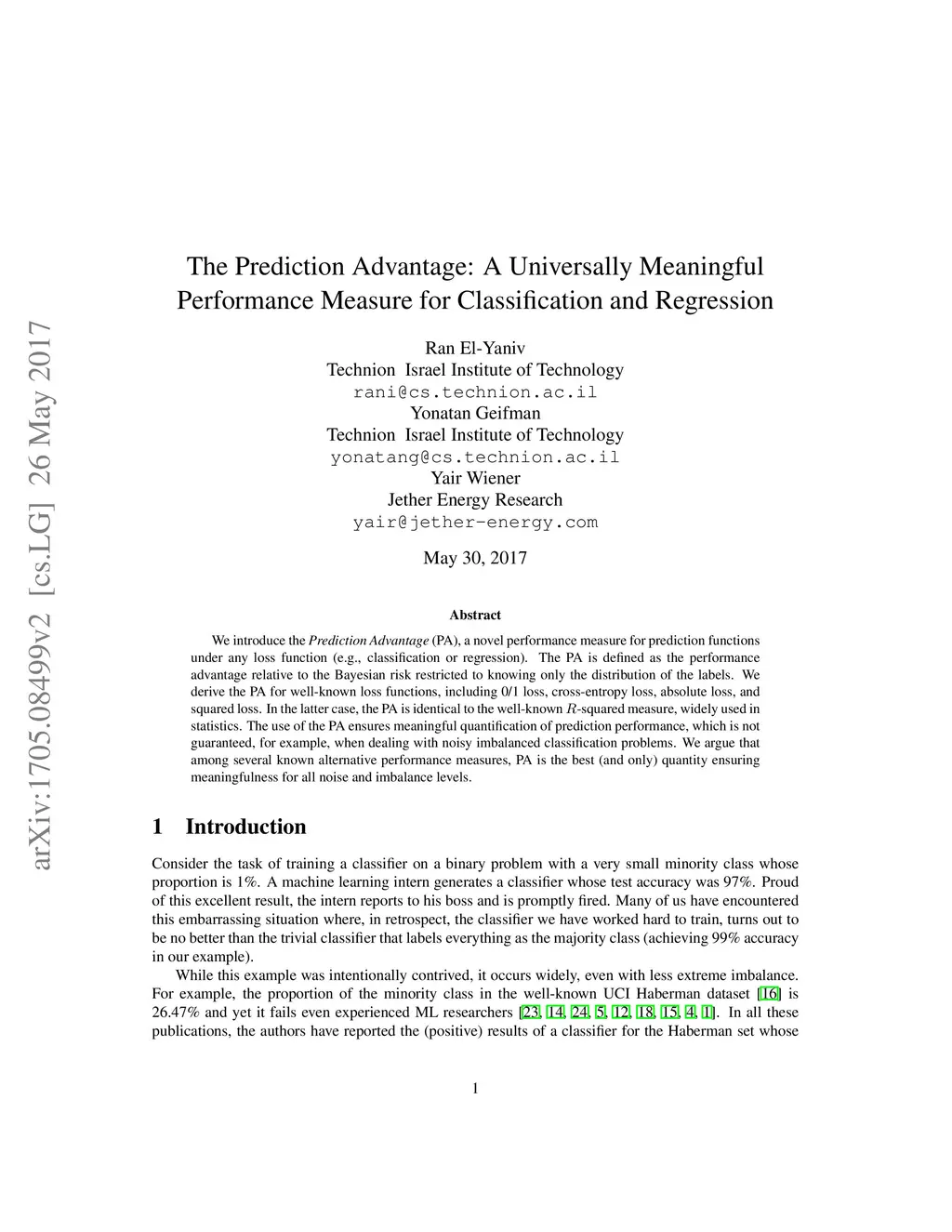 We introduce the Prediction Advantage (PA), a novel performance measure for prediction functions under any loss function (e.g., classification or regression). The PA is defined as the performance advantage relative to the Bayesian risk restricted to knowing only the distribution of the labels. We derive the PA for well-known loss functions, including 0/1 loss, cross-entropy loss, absolute loss, and squared loss. In the latter case, the PA is identical to the well-known R-squared measure, widely used in statistics. The use of the PA ensures meaningful quantification of prediction performance, which is not guaranteed, for example, when dealing with noisy imbalanced classification problems. We argue that among several known alternative performance measures, PA is the best (and only) quantity ensuring meaningfulness for all noise and imbalance levels.