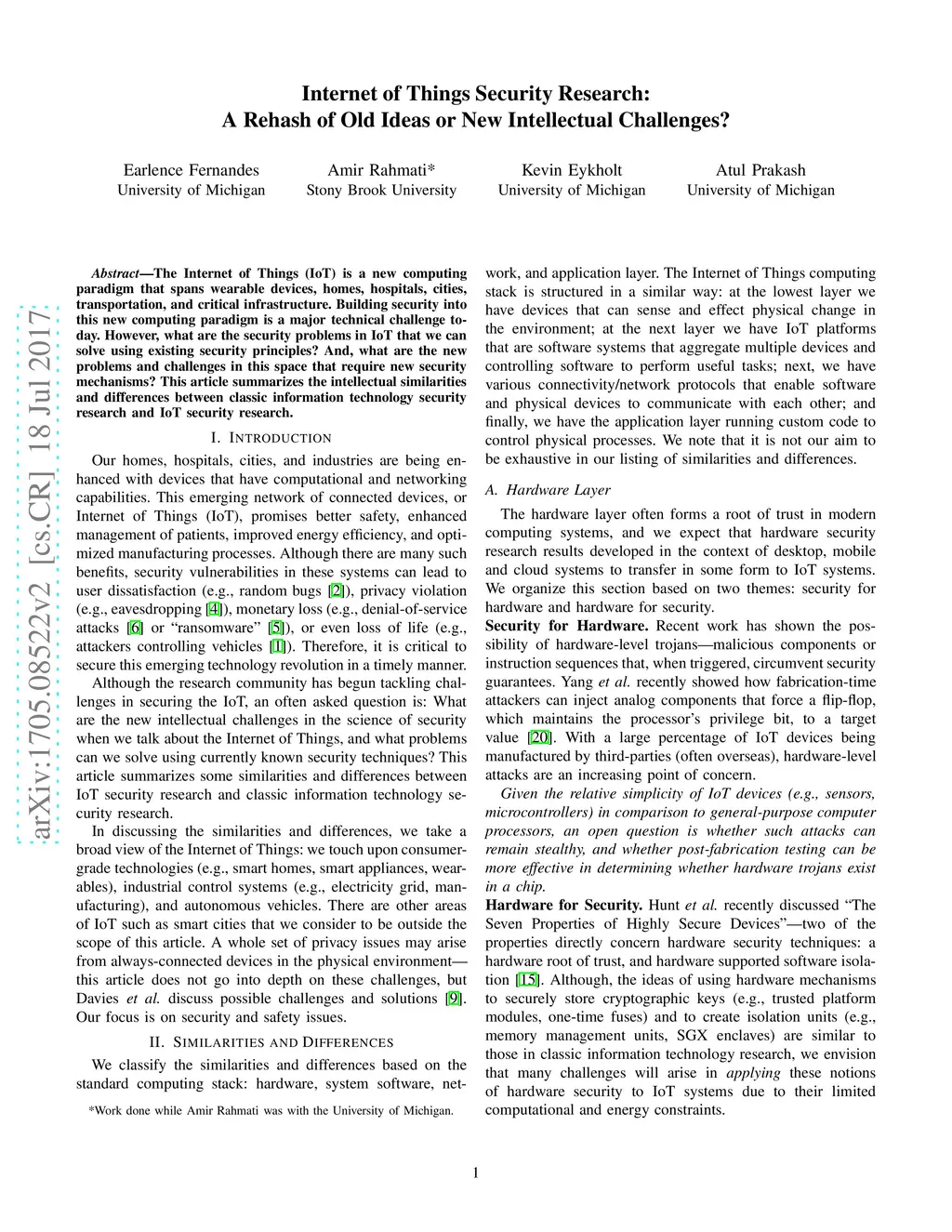The Internet of Things (IoT) is a new computing paradigm that spans wearable devices, homes, hospitals, cities, transportation, and critical infrastructure. Building security into this new computing paradigm is a major technical challenge today. However, what are the security problems in IoT that we can solve using existing security principles? And, what are the new problems and challenges in this space that require new security mechanisms? This article summarizes the intellectual similarities and differences between classic information technology security research and IoT security research.