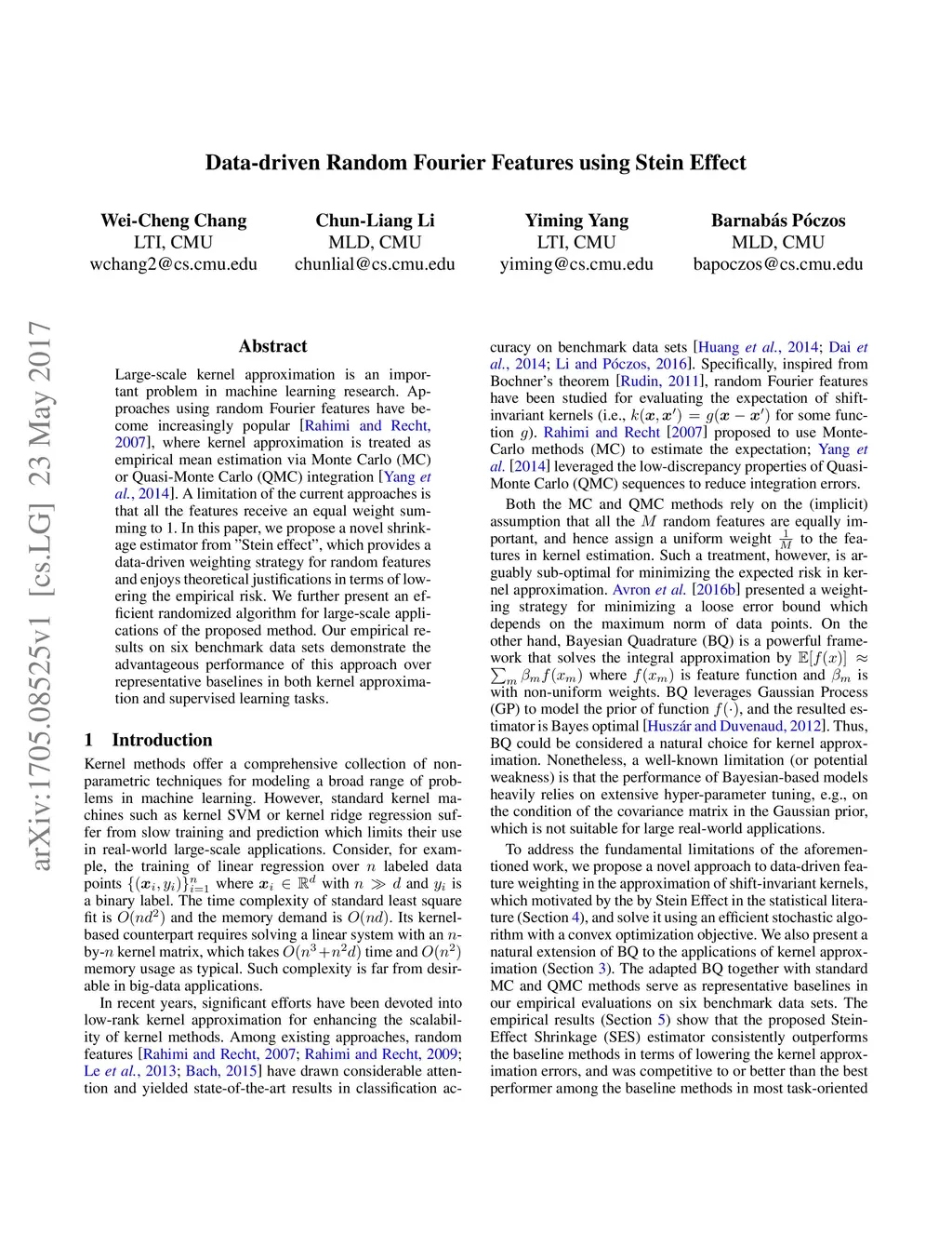 Large-scale kernel approximation is an important problem in machine learning research. Approaches using random Fourier features have become increasingly popular [Rahimi and Recht, 2007], where kernel approximation is treated as empirical mean estimation via Monte Carlo (MC) or Quasi-Monte Carlo (QMC) integration [Yang et al., 2014]. A limitation of the current approaches is that all the features receive an equal weight summing to 1. In this paper, we propose a novel shrinkage estimator from "Stein effect", which provides a data-driven weighting strategy for random features and enjoys theoretical justifications in terms of lowering the empirical risk. We further present an efficient randomized algorithm for large-scale applications of the proposed method. Our empirical results on six benchmark data sets demonstrate the advantageous performance of this approach over representative baselines in both kernel approximation and supervised learning tasks.