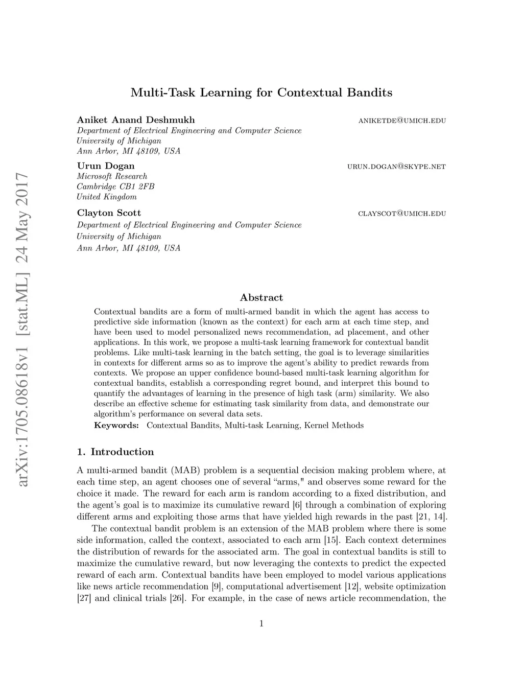 Contextual bandits are a form of multi-armed bandit in which the agent has access to predictive side information (known as the context) for each arm at each time step, and have been used to model personalized news recommendation, ad placement, and other applications. In this work, we propose a multi-task learning framework for contextual bandit problems. Like multi-task learning in the batch setting, the goal is to leverage similarities in contexts for different arms so as to improve the agent's ability to predict rewards from contexts. We propose an upper confidence bound-based multi-task learning algorithm for contextual bandits, establish a corresponding regret bound, and interpret this bound to quantify the advantages of learning in the presence of high task (arm) similarity. We also describe an effective scheme for estimating task similarity from data, and demonstrate our algorithm's performance on several data sets.