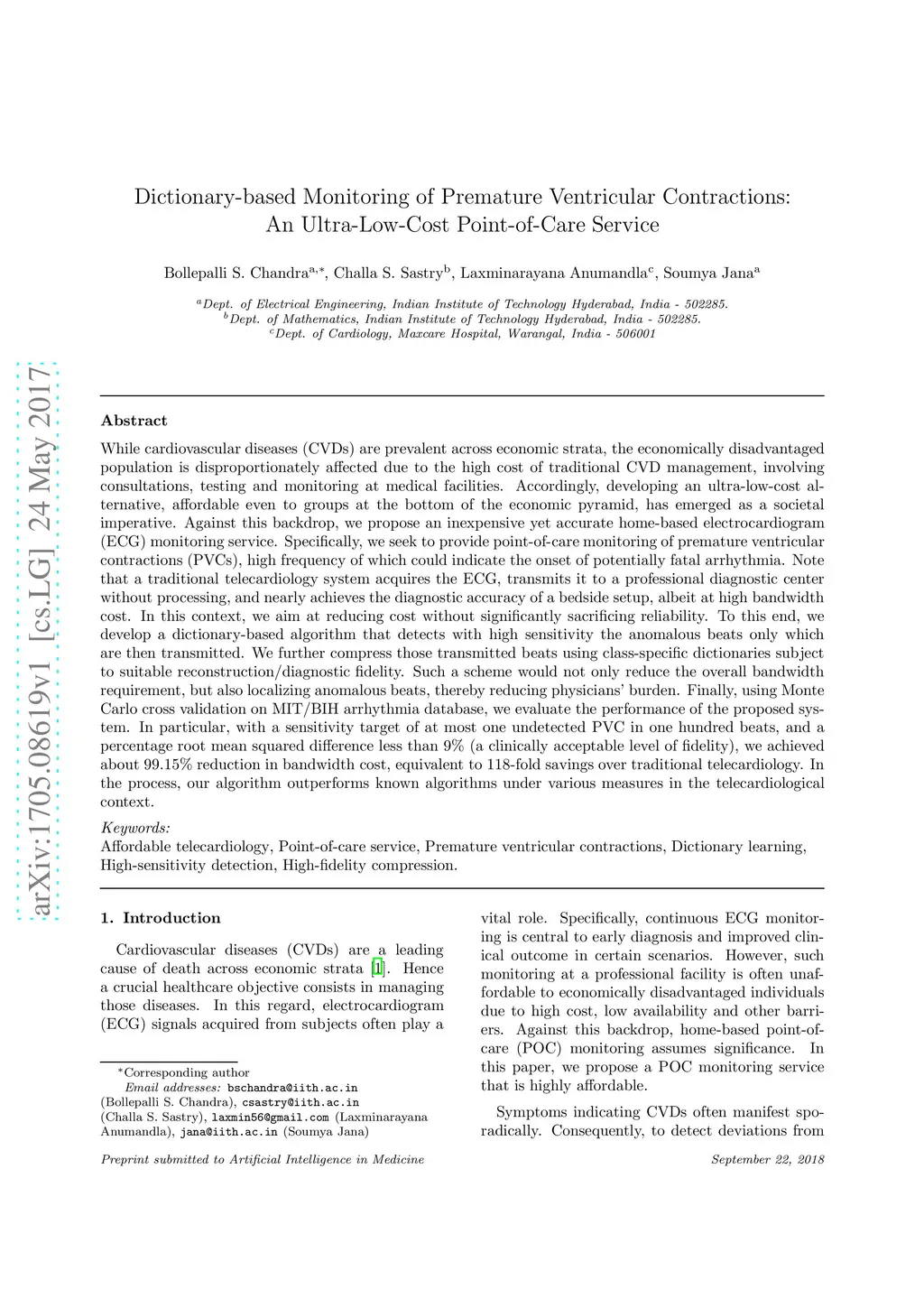 While cardiovascular diseases (CVDs) are prevalent across economic strata, the economically disadvantaged population is disproportionately affected due to the high cost of traditional CVD management. Accordingly, developing an ultra-low-cost alternative, affordable even to groups at the bottom of the economic pyramid, has emerged as a societal imperative. Against this backdrop, we propose an inexpensive yet accurate home-based electrocardiogram(ECG) monitoring service. Specifically, we seek to provide point-of-care monitoring of premature ventricular contractions (PVCs), high frequency of which could indicate the onset of potentially fatal arrhythmia. Note that a traditional telecardiology system acquires the ECG, transmits it to a professional diagnostic centre without processing, and nearly achieves the diagnostic accuracy of a bedside setup, albeit at high bandwidth cost. In this context, we aim at reducing cost without significantly sacrificing reliability. To this end, we develop a dictionary-based algorithm that detects with high sensitivity the anomalous beats only which are then transmitted. We further compress those transmitted beats using class-specific dictionaries subject to suitable reconstruction/diagnostic fidelity. Such a scheme would not only reduce the overall bandwidth requirement, but also localising anomalous beats, thereby reducing physicians' burden. Finally, using Monte Carlo cross validation on MIT/BIH arrhythmia database, we evaluate the performance of the proposed system. In particular, with a sensitivity target of at most one undetected PVC in one hundred beats, and a percentage root mean squared difference less than 9% (a clinically acceptable level of fidelity), we achieved about 99.15% reduction in bandwidth cost, equivalent to 118-fold savings over traditional telecardiology.