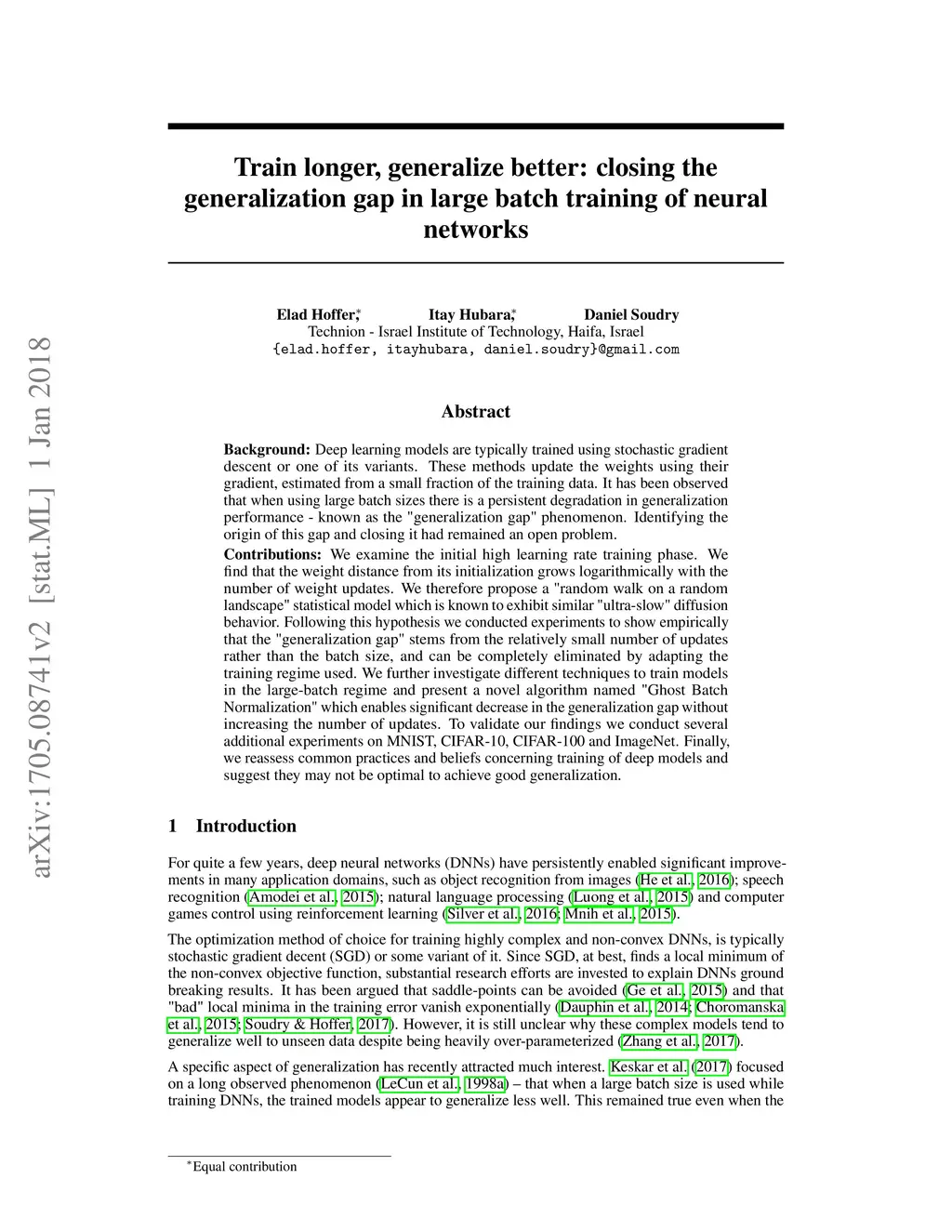 Background: Deep learning models are typically trained using stochastic gradient descent or one of its variants. These methods update the weights using their gradient, estimated from a small fraction of the training data. It has been observed that when using large batch sizes there is a persistent degradation in generalization performance - known as the "generalization gap" phenomena. Identifying the origin of this gap and closing it had remained an open problem. Contributions: We examine the initial high learning rate training phase. We find that the weight distance from its initialization grows logarithmically with the number of weight updates. We therefore propose a "random walk on random landscape" statistical model which is known to exhibit similar "ultra-slow" diffusion behavior. Following this hypothesis we conducted experiments to show empirically that the "generalization gap" stems from the relatively small number of updates rather than the batch size, and can be completely eliminated by adapting the training regime used. We further investigate different techniques to train models in the large-batch regime and present a novel algorithm named "Ghost Batch Normalization" which enables significant decrease in the generalization gap without increasing the number of updates. To validate our findings we conduct several additional experiments on MNIST, CIFAR-10, CIFAR-100 and ImageNet. Finally, we reassess common practices and beliefs concerning training of deep models and suggest they may not be optimal to achieve good generalization.