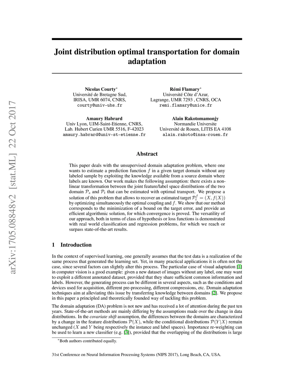This paper deals with the unsupervised domain adaptation problem, where one wants to estimate a prediction function in a given target domain without any labeled sample by exploiting the knowledge available from a source domain where labels are known. Our work makes the following assumption: there exists a non-linear transformation between the joint feature/label space distributions of the two domain and . We propose a solution of this problem with optimal transport, that allows to recover an estimated target by optimizing simultaneously the optimal coupling and . We show that our method corresponds to the minimization of a bound on the target error, and provide an efficient algorithmic solution, for which convergence is proved. The versatility of our approach, both in terms of class of hypothesis or loss functions is demonstrated with real world classification and regression problems, for which we reach or surpass state-of-the-art results.