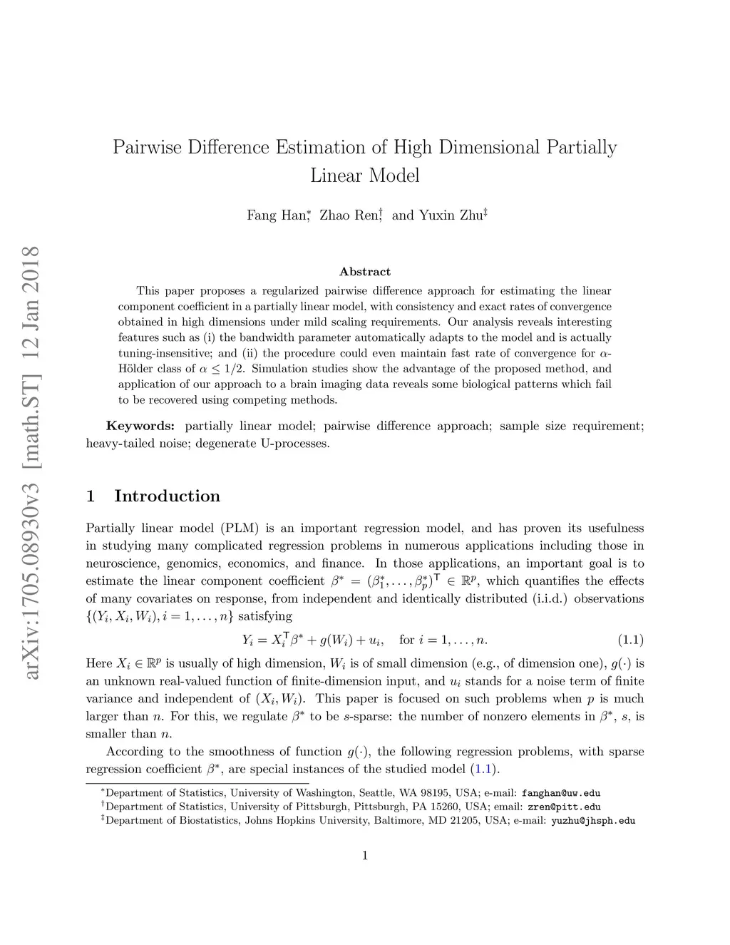This paper proposes a regularized pairwise difference approach for estimating the linear component coefficient in a partially linear model, with consistency and exact rates of convergence obtained in high dimensions under mild scaling requirements. Our analysis reveals interesting features such as (i) the bandwidth parameter automatically adapts to the model and is actually tuning-insensitive; and (ii) the procedure could even maintain fast rate of convergence for -H\"older class of . Simulation studies show the advantage of the proposed method, and application of our approach to a brain imaging data reveals some biological patterns which fail to be recovered using competing methods.