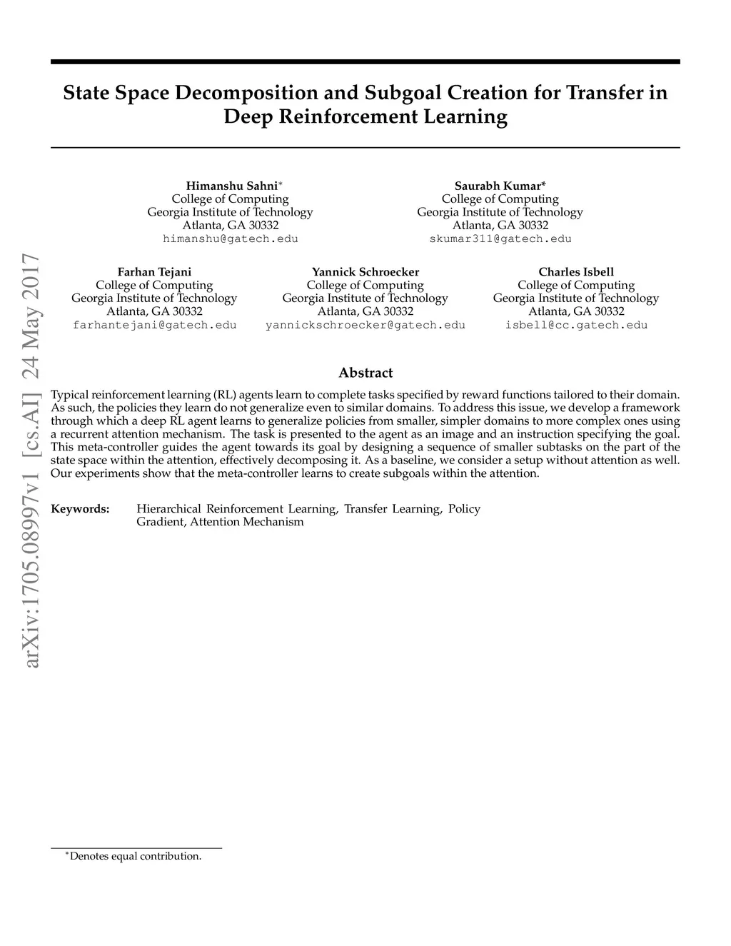 Typical reinforcement learning (RL) agents learn to complete tasks specified by reward functions tailored to their domain. As such, the policies they learn do not generalize even to similar domains. To address this issue, we develop a framework through which a deep RL agent learns to generalize policies from smaller, simpler domains to more complex ones using a recurrent attention mechanism. The task is presented to the agent as an image and an instruction specifying the goal. This meta-controller guides the agent towards its goal by designing a sequence of smaller subtasks on the part of the state space within the attention, effectively decomposing it. As a baseline, we consider a setup without attention as well. Our experiments show that the meta-controller learns to create subgoals within the attention.