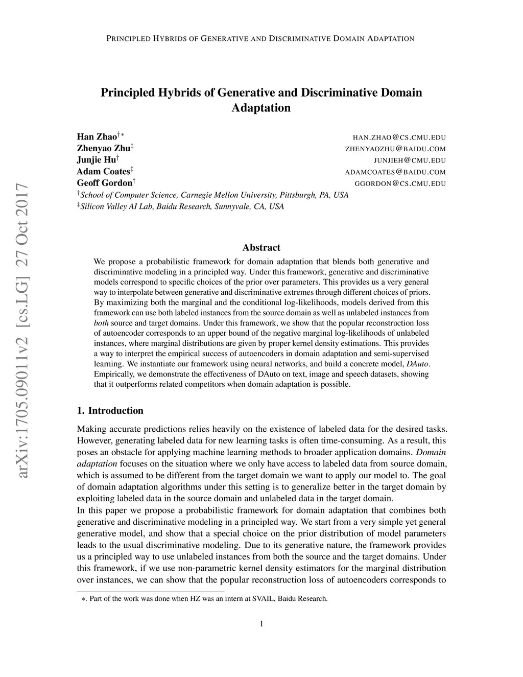 We propose a probabilistic framework for domain adaptation that blends both generative and discriminative modeling in a principled way. By maximizing both the marginal and the conditional log-likelihoods, models derived from this framework can use both labeled instances from the source domain as well as unlabeled instances from both source and target domains. Under this framework, we show that the popular reconstruction loss of autoencoder corresponds to an upper bound of the negative marginal log-likelihoods of unlabeled instances, where marginal distributions are given by proper kernel density estimations. This provides a way to interpret the empirical success of autoencoders in domain adaptation and semi-supervised learning. We instantiate our framework using neural networks, and build a concrete model, DAuto. Empirically, we demonstrate the effectiveness of DAuto on text, image and speech datasets, showing that it outperforms related competitors when domain adaptation is possible.